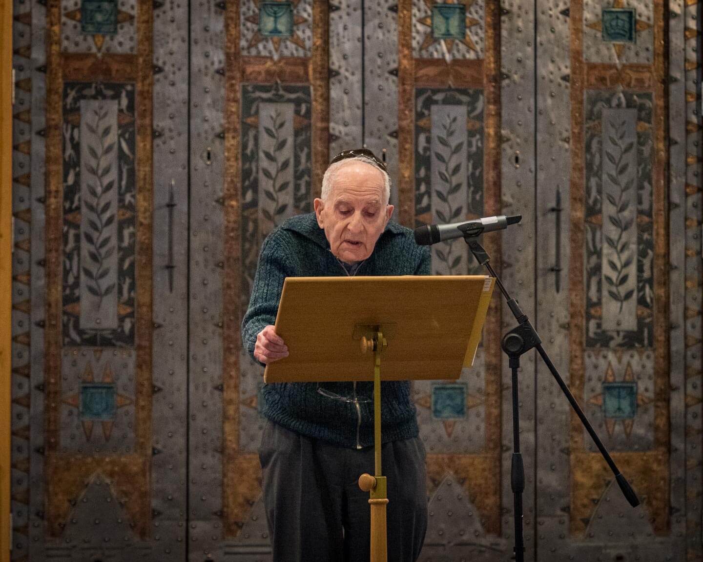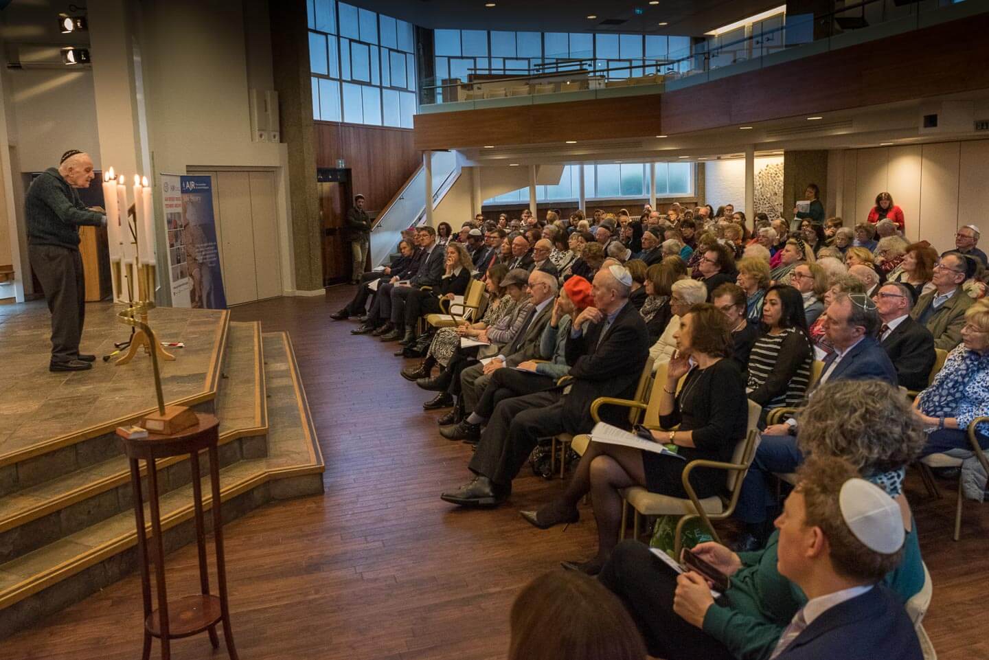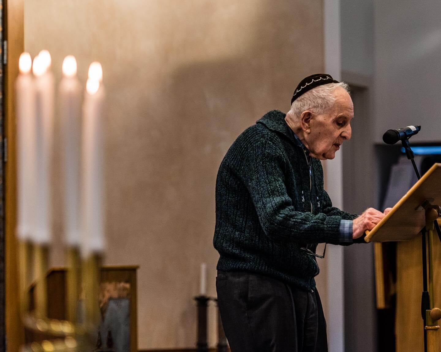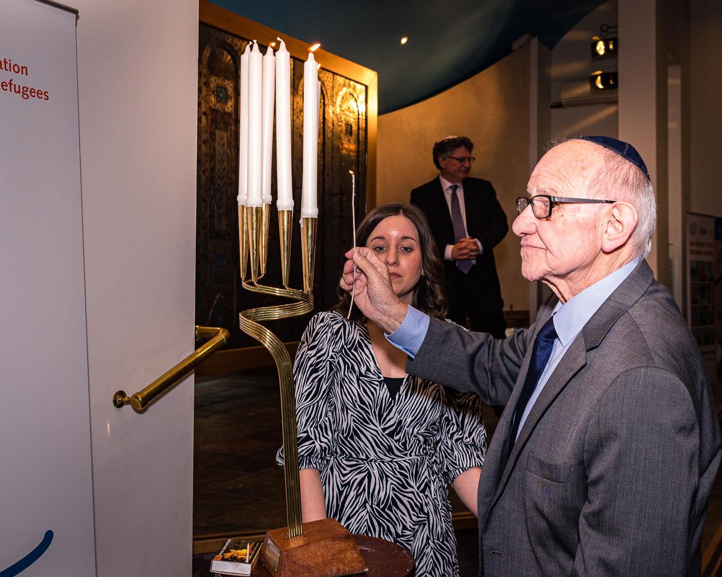 Our speakers addressed this year’s theme ‘Stand Together’. The service and candle lighting was led by Rabbi Stuart Altshuler. Auschwitz survivors Frank Bright and Zigi Shipper BEM spoke about their experiences in the infamous concentration camp and the importance of testimony and sharing history with future generations. Hephzibah Rudofsky, daughter of Lady Zahava Kohn, spoke about standing together to recount history. Jane Banham, an AJR volunteer who works on our My Story project, shared excerpts from Dr Peter Brunner, Mary Green and Suzanne Lee as recorded in their My Story books. Emma Harrod, granddaughter of Zigi Shipper BEM recited a moving poem titled, “A Prayer of a Jewish Leader in an Extermination Camp”.