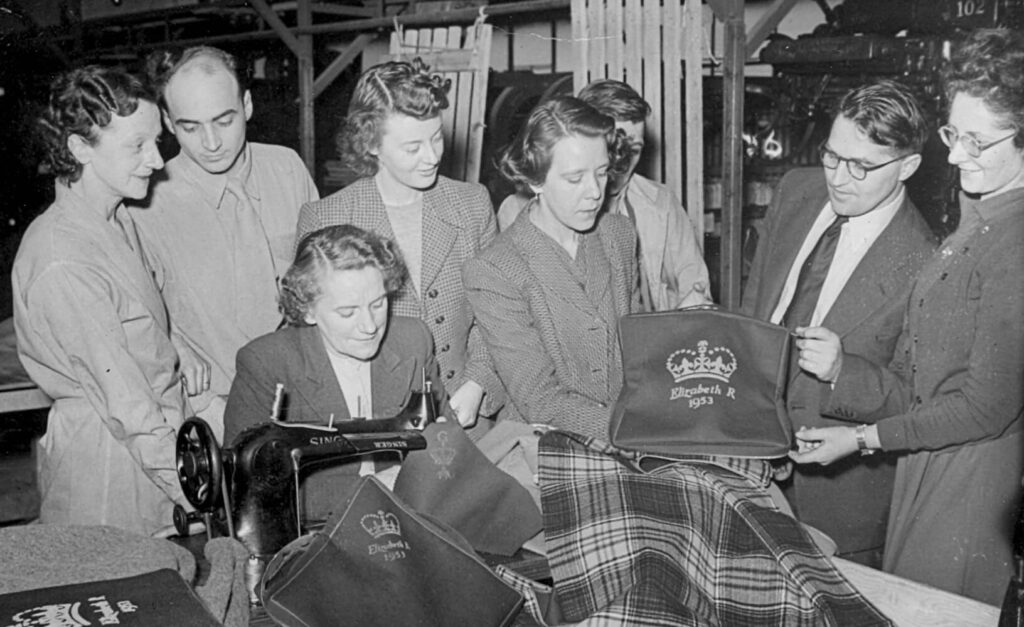Photo: Workers inside the Kagan mill producing Gannex cushion covers and rug for the Coronation of Queen Elizabeth II in 1953. Credit: HSFA