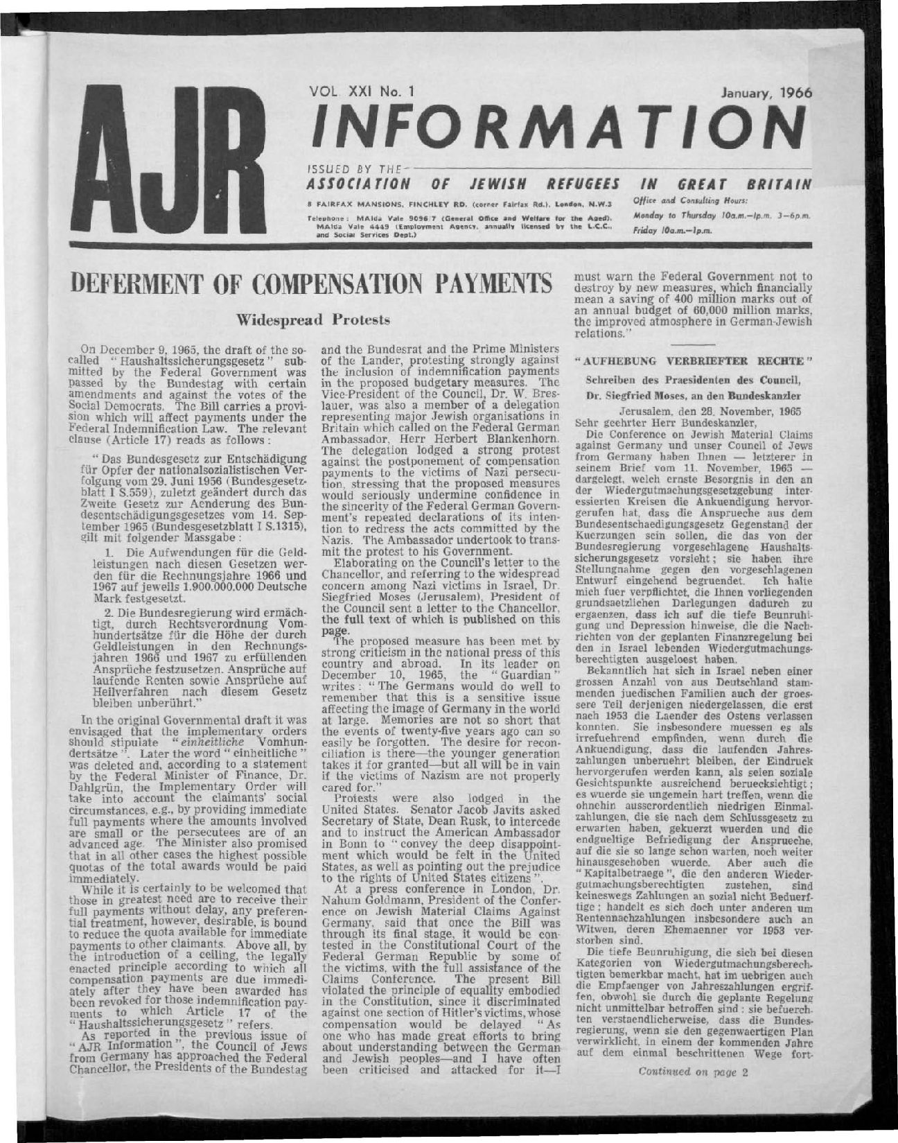 On January 3, our Chairman, Mr. Alfred S. Dresel, will celebrate his 75th birthday. All members of the AJR are indebted to him for his guidance and his decisive contribution to the steady expansion of our work. Trained as a lawyer, he held a responsible position with the old-established banking house of Mendelssohn & Co. in Berlin before he came to this country in 1938. when the restitution and compensation laws were enacted, he became the trusted ‘egal adviser to many victims of the Nazi regime. At the same time, he has, throughout the years, devoted an exceedingly great amount of his time to the cause of the AJR. A Board member since the inception of the organisation, he joined the Executive after the war, became a Vice-Chairman m 1954 and was elected Chairman in 1964. Two traits stand out among his manifold qualifications: his skill as a negotiator and nis human kindness. The unreserved sincerity with which he represents the interests of the AJR has won him the respect and trust of all who have had dealings with him. Averse to any kind of diplomacy”, he succeeds by his straightforwardness, flexibility, perseverance and unshakable optimism. His grasp of the wider issues is coupled with an astounding sense of detail. Anxious to arrive at just decisions he never loses sight of the fact mat the fate of human beings is at stake. Under his guidance the AJR Executive If tv. a close team of fellow workers, the regular Executive Meetings at which the activities of the Executive Members in their particular spheres are co-ordinated. excel in a spirit of responsibility, mutual understanding and personal comradeship, it is due to the adroit way in which the Chairman conducts the deliberations. The work for the Homes has always been particularly close to his heart and, as a member of the Management Committee, he has been associated with this important task from the very beginning. He is constantly occupied with the day-to-day questions which comprise matters of general policy, of finances and admission, and of new building schemes. As a member of the London Executive of the Council of Jews from Germany, Mr. Dresel has, for many years, also been one of the Council’s leading spokesmen in questions of restitution and compensation. Whenever need arises—and there has been no lack of emergency situations—he is ready to travel to Germany, and the manner in which he puts our case has been effective in many instances. As Chairman of the Leo Baeck Charitable Trust, he takes a responsible part in the administration of the funds allocated to the Council for the implementation of constructive welfare schemes in various parts of the world. Those who know Mr. Dresel personally will agree that his appearance and his vigour belie his age. He still enjoys a swim and a brisk walk in his beloved Swiss Alps, and he bears the burden of his duties with imperturbable cheerfulness. His birthday gives us the welcome opportunity of thanking him for all he has done for us, wishing him many happy returns and looking forward to many more years of happy co-operation.