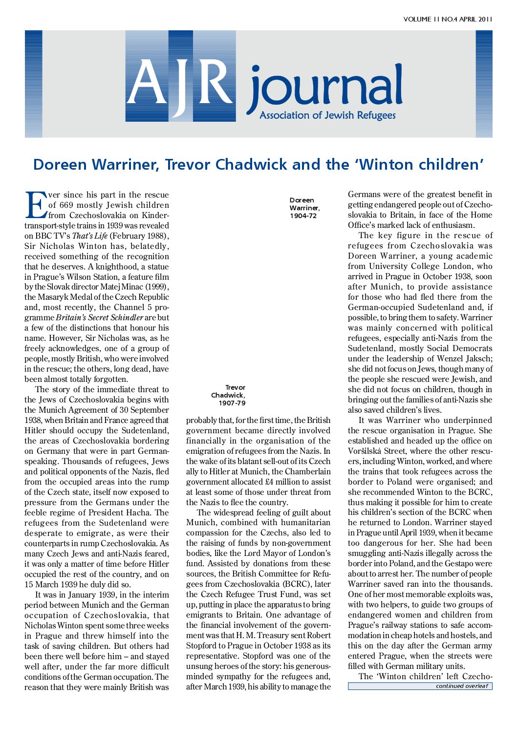 Ever since his part in the rescue of 669 mostly Jewish children from Czechoslovakia on Kindertransport- style trains in 1939 was revealed on BBC TV’s That’s Life (February 1988), Sir Nicholas Winton has, belatedly, received something of the recognition that he deserves. A knighthood, a statue in Prague’s Wilson Station, a feature film by the Slovak director Matej Minac (1999), the Masaryk Medal of the Czech Republic and, most recently, the Channel 5 programme Britain’s Secret Schindler are but a few of the distinctions that honour his name. However, Sir Nicholas was, as he freely acknowledges, one of a group of people, mostly British, who were involved in the rescue; the others, long dead, have been almost totally forgotten. The story of the immediate threat to the Jews of Czechoslovakia begins with the Munich Agreement of 30 September 1938, when Britain and France agreed that Hitler should occupy the Sudetenland, the areas of Czechoslovakia bordering on Germany that were in part Germanspeaking. Thousands of refugees, Jews and political opponents of the Nazis, fled from the occupied areas into the rump of the Czech state, itself now exposed to pressure from the Germans under the feeble regime of President Hacha. The refugees from the Sudetenland were desperate to emigrate, as were their counterparts in rump Czechoslovakia. As many Czech Jews and anti-Nazis feared, it was only a matter of time before Hitler occupied the rest of the country, and on 15 March 1939 he duly did so. It was in January 1939, in the interim period between Munich and the German occupation of Czechoslovakia, that Nicholas Winton spent some three weeks in Prague and threw himself into the task of saving children. But others had been there well before him – and stayed well after, under the far more difficult conditions of the German occupation. The reason that they were mainly British was probably that, for the first time, the British government became directly involved financially in the organisation of the emigration of refugees from the Nazis. In the wake of its blatant sell-out of its Czech ally to Hitler at Munich, the Chamberlain government allocated £4 million to assist at least some of those under threat from the Nazis to flee the country. The widespread feeling of guilt about Munich, combined with humanitarian compassion for the Czechs, also led to the raising of funds by non-government bodies, like the Lord Mayor of London’s fund. Assisted by donations from these sources, the British Committee for Refugees from Czechoslovakia (BCRC), later the Czech Refugee Trust Fund, was set up, putting in place the apparatus to bring emigrants to Britain. One advantage of the financial involvement of the government was that H. M. Treasury sent Robert Stopford to Prague in October 1938 as its representative. Stopford was one of the unsung heroes of the story: his generousminded sympathy for the refugees and, after March 1939, his ability to manage the Germans were of the greatest benefit in getting endangered people out of Czechoslovakia to Britain, in face of the Home Office’s marked lack of enthusiasm. The key figure in the rescue of refugees from Czechoslovakia was Doreen Warriner, a young academic from University College London, who arrived in Prague in October 1938, soon after Munich, to provide assistance for those who had fled there from the German-occupied Sudetenland and, if possible, to bring them to safety. Warriner was mainly concerned with political refugees, especially anti-Nazis from the Sudetenland, mostly Social Democrats under the leadership of Wenzel Jaksch; she did not focus on Jews, though many of the people she rescued were Jewish, and she did not focus on children, though in bringing out the families of anti-Nazis she also saved children’s lives. It was Warriner who underpinned the rescue organisation in Prague. She established and headed up the office on Voršilská Street, where the other rescuers, including Winton, worked, and where the trains that took refugees across the border to Poland were organised; and she recommended Winton to the BCRC, thus making it possible for him to create his children’s section of the BCRC when he returned to London. Warriner stayed in Prague until April 1939, when it became too dangerous for her. She had been smuggling anti-Nazis illegally across the border into Poland, and the Gestapo were about to arrest her. The number of people Warriner saved ran into the thousands. One of her most memorable exploits was, with two helpers, to guide two groups of endangered women and children from Prague’s railway stations to safe accommodation in cheap hotels and hostels, and this on the day after the German army entered Prague, when the streets were filled with German military units. The ‘Winton children’ left Czecho slovakia legally, largely thanks to Sir Nicholas’s tireless efforts in fulfilling all the bureaucratic requirements for their entry into Britain, in finding homes for them and in locating people who would put up a guarantee of £50 for them, as demanded by the government. But Winton left Prague on 21 January 1939 and could play no part in the organisation of the refugee transports at the Czech end. Fortunately, a replacement was at hand, in the person of Trevor Chadwick, a teacher at a school in Swanage, Dorset, who had come to Prague to bring two refugee boys to places at the school. In the event, they also took a third child – Chadwick’s mother provided the guarantee – and she became the poet Gerda Mayer, whose lines grace, among other publications, the book that accompanied the AJR’s exhibition Continental Britons (2002). Chadwick delivered the three children, then returned to Prague to work for the rescue of further refugees. According to the recently published and very informative book by his son, William Chadwick, The Rescue of the Prague Refugees 1938/39 (Leicester: Matador, 2010), he had thousands of refugees on his lists,