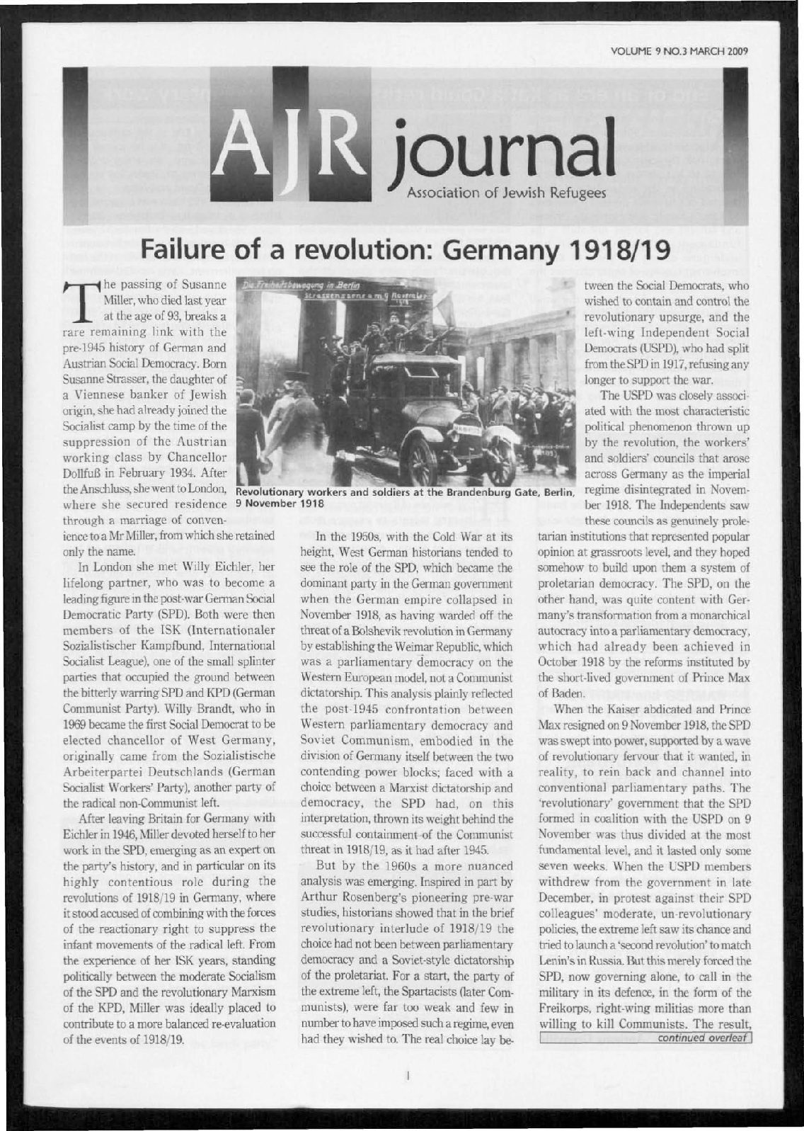 The passing of Susanne Miller, who died last year at the age of 93, breaks a rare remaining link with the pre-1945 history of German and Austrian Social Democracy. Bom Susanne Strasser, the daughter of a Viennese banker of Jewish origin, she had already joined the Socialist camp by the time of the suppression of the Austrian working class by Chancellor Dollfuß in February 1934. After the Anschluss, she went to London, where she secured residence through a marriage of convenience to a Mr Miller, from which she retained only the name. In London she met Willy Eichler, her lifelong partner, who was to become a leading figure in the post-war German Social Democratic Party (SPD). Both were then members of the ISK (Internationaler Sozialistischer Kampfbund, International Socialist League), one of the small splinter parties that occupied the ground between the bitterly warring SPD and KPD (German Communist Party). Willy Brandt, who in 1969 became the first Social Democrat to be elected chancellor of West Germany, originally came from the Sozialistische Arbeiterpartei Deutschlands (German Socialist Workers’ Party), another party of the radical non-Communist left. After leaving Britain for Germany with Eichler in 1946, Miller devoted herself to her work in the SPD, emerging as an expert on the party’s history, and in particular on its highly contentious role during the revolutions of 1918/19 in Germany, where it stood accused of combining with the forces of the reactionary right to suppress the infant movements of the radical left. From the experience of her ISK years, standing politically between the moderate Socialism of the SPD and the revolutionary Marxism of the KPD, Miller was ideally placed to contribute to a more balanced re-evaluation of the events of 1918/19. In the 1950s, with the Cold War at its height West German historians tended to see the role of the SPD, which became the dominant party in the German government when the German empire collapsed in November 1918, as having warded off the threat of a Bolshevik revolution in Germany by establishing the Weimar Republic, which was a parliamentary democracy on the Western European model, not a Communist dictatorship. This analysis plainly reflected the post-1945 confrontation between Western parliamentary democracy and Soviet Communism, embodied in the division of Germany itself between the two contending power blocks; faced with a choice between a Marxist dictatorship and democracy, the SPD had, on this interpretation, thrown its weight behind the successful containment of the Communist threat in 1918/19, as it had after 1945. But by the 1960s a more nuanced analysis was emerging. Inspired in part by Arthur Rosenberg’s pioneering pre-war studies, historians showed that in the brief revolutionary interlude of 1918/19 the choice had not been between parliamentary democracy and a Soviet-style dictatorship of the proletariat. For a start, the party of the extreme left, the Spartacists (later Communists), were far too weak and few in number to have imposed such a regime, even had they wished to. The real choice lay between the Social Democrats, who wished to contain and control the revolutionary upsurge, and the left-wing Independent Social Democrats (USPD), who had split from the SPD in 1917, refusing any longer to support the war. The USPD was closely associated with the most characteristic political phenomenon thrown up by the revolution, the workers’ and soldiers’ councils that arose across Germany as the imperial regime disintegrated in November 1918. The Independents saw these councils as genuinely proletarian institutions that represented popular opinion at grassroots level, and they hoped somehow to build upon them a system of proletarian democracy. The SPD, on the other hand, was quite content with Germany’s transformation from a monarchical autocracy into a parliamentary democracy, which had already been achieved in October 1918 by the reforms instituted by the short-lived government of Prince Max of Baden. When the Kaiser abdicated and Prince Max resigned on 9 November 1918, the SPD was swept into power, supported by a wave of revolutionary fervour that it wanted, in reality, to rein back and channel into conventional parliamentary paths. The ‘revolutionary’ government that the SPD formed in coalition with the USPD on 9 November was thus divided at the most fundamental level, and it lasted only some seven weeks. When the USPD members withdrew from the government in late December, in protest against their SPD colleagues’ moderate, un-revolutionary policies, the extreme left saw its chance and tried to launch a ‘second revolution’ to match Lenin’s in Russia. But this merely forced the SPD, now goveming alone, to call in the military in its defence, in the form of the Freikorps, right-wing militias more than willing to kill Communists. The result, tragically, was the murder of the Spartacist leaders, Rosa Luxemburg and Karl Liebknecht, in January 1919 and the brutal suppression of the uprising, by right-wing forces nominally under the control of Social Democratic ministers. The Spartacist Uprising led to a fatal split in the German left. After the elections of January 1919, which gave power to the SPD in coalition with moderate non-Socialist parties, the USPD moved decisively to the left. It opposed the SPD over the latter’s relations with the military, its refusal to embark on a radical programme of nationalisation of industry and its entire strategy of establishing a ‘bourgeois’ parliamentary democracy in Germany instead of some form of workers’ government. In 1920, the majority of the USPD voted to join the Communist Party; when the remainder rejoined the SPD in 1922, the division within the German working-class movement became permanent. Even when faced with the rise of Nazism a decade later, the hostility between SPD and KPD made a united working-class front against Hitler impossible. The events o