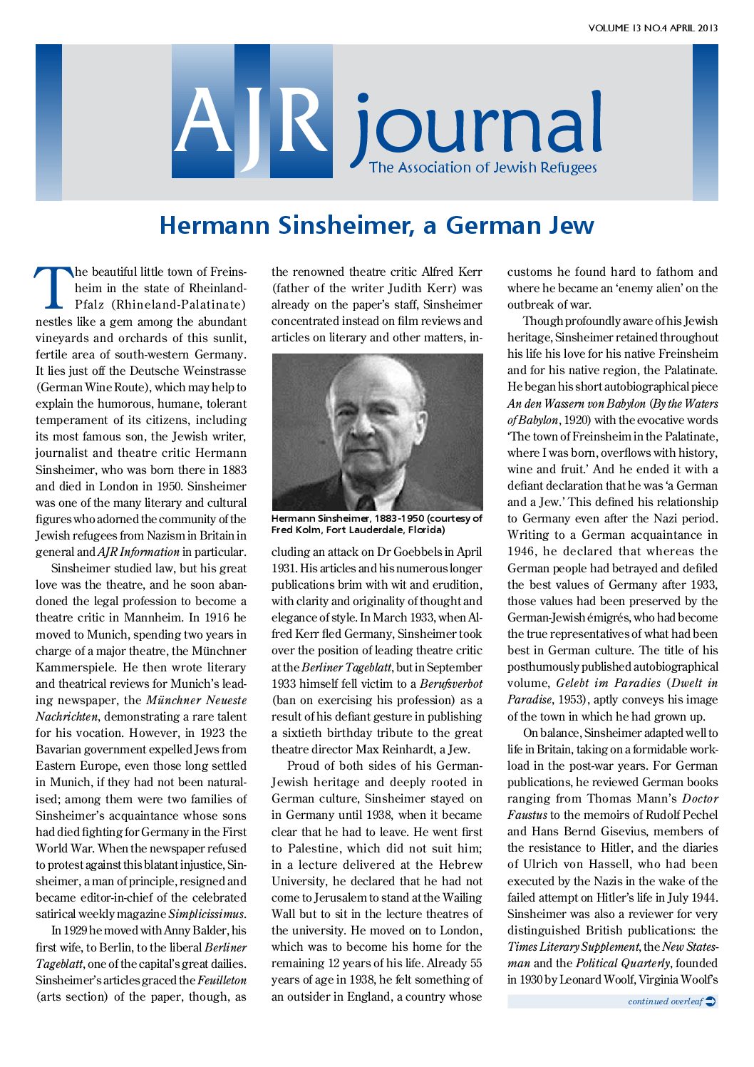Reading the interesting article ‘Anglo-Jewry and the Jewish refugees from Nazism’ (December 2012), I was amazed that there was not the slightest mention of the refugees from Czechoslovakia – there were quite a number of us. I have been a member of the AJR for some 20 years and, reading the AJR Journal regularly all those years, I cannot recall one article about the Jews of Czechoslovakia. I arrived in the UK at Tilbury on 26 May 1939 with my mother on the crowded ship Warszawa from Gdynia, Poland, with a badly broken arm in heavy plaster, a large trunk and a small suitcase. I was seven years old and can recall it all very clearly. We passed through a rather surly immigration and search and then were taken by bus to a hastily arranged reception centre in Bayswater, a former school in which hundreds of beds had been set up in all the classrooms. My father joined us about ten days later as we had only two tickets for the ship. Dad had managed to bribe his way on to a rather small postal package boat with just eight passenger seats going to Stockholm; I don’t know how he managed to complete the rest of his journey to Tilbury. Then, together, we were sent with around 50 other Czech refugees to a hostel in Clacton-on-Sea and we stayed there until just after war was declared. After some months I and another boy my age were sent to school in Holland-on-Sea by bus, with the bus conductor putting us off at the school. We knew no English except two words – yes and no – and we had to put up our hand if we needed to go to the loo, and we were surrounded by a crowd of the schoolchildren staring at us in our ‘funny’ clothes. For me life became one great adventure of ups and downs and new experiences. After several months we were all moved to another hostel in a large old mansion in Dorking. Finally, after about eight months, my parents and I were allowed to leave as we were classified as ‘friendly aliens’. We moved to Taunton in Somerset, where my father was offered a new career at the age of 41 as a school cleaner. This was a town with only two other English-Jewish families. Life started to improve for my parents when, around a year later, they were able to start a small business on a shoestring and then I was able to leave home to study a profession. In 1939 the Jewish population of Czechoslovakia was 360,000, all of whom considered themselves Czech first and Jewish second. I am one of the last few survivors of a huge family which can trace its roots, mostly in the Bohumin and Ostrava area, back to around the 1870s. About 70 members of my close extended family were murdered in the Holocaust, including three grandparents and my mother’s brother as well as around 32 great-uncles and greataunts. All my great-grandparents came from Galicia in what is now just a few miles over the border from the Czech Republic, but before 1918 Galicia and Czechoslovakia were part of Austria- Hungary so they did not cross any borders. All members of my family born before 1918, including my parents, were citizens of Austria-Hungary and that is why we were all bilingual in German and Czech. Most of them became Czech citizens in 1918, while just a very few who lived in Cracow by then became Polish. At home in Ostrava, I can remember my grandparents very well indeed: they spoke German, Czech, Yiddish and Polish all mixed up without ever completing a sentence in one tongue! My mother was sent to a Jewish ladies’ finishing school in Hanover as a young girl and my father and his brother were sent to Frankfurt, where they both obtained doctorates in law and political economy in the 1920s. My father returned to Czechoslovakia in 1924 and studied for another doctorate in Czech law, eventually becoming a partner in a prominent law office in Ostrava. In nearby Bohumin, my father’s family owned a number of businesses in the main street – Simon Kassler Warenhaus, Kassler Möbel store, Ferdinand Kassler Ironmonger & Tool store – and their sister, my grandmother Auguste and her husband, my grandfather Leopold Lobl Wiener, were owners of the Grand Hotel from around 1880. Another sister, Josefina, was coowner of a ready-made garment factory with her husband and two sons in Prostejov. Another branch of Kasslers owned even more businesses in Ostrava-Privoz and Frydek. My mother’s family, the Hupperts, were mainly in the food business. Five of my great-uncles were butchers, each with their own shop, and three of them – Otto, Hugo and Fritz – had a meatprocessing business employing about 40 staff as well as a delicatessen shop in the main street in Ostrava which they sold to their sister Anka. My great-grandfather, Abraham Huppert, owned a grocery shop in Marianske Hory Ostrava and a Gasthaus in Ostrava- Svinov from the 1880s, before disposing of the gasthaus, the Hotel Post, to his eldest daughter Resi and her husband Julius (Julek) Farber. He then bought a large hotel in Las Cyganski, Bielski- Biala (Zigeunerwald, Bielitz), which he left to my youngest great-uncle, Josef Huppert, in 1934. The Farber’s Hotel Post opposite the Ostrava-Svinov railway, which after 1912 was owned by my grandparents Resi and Julius Farber, became enormously prosperous as the railway station was used by thousands of workers travelling to the largest iron and steel foundry in Europe in nearby Vitkovice and Ostrava’s industrial area. This explains why the Hotel Post was reputed to sell 20,000 litres of beer weekly and was open dawn to dusk. The basic facts about the Czech-Jewish refugees can be found on the websites ‘CAST – Czech and Slovak Things’ and ‘Jewish Virtual Library – Czechoslovakia’. There were, in fact, about 20,000 refugees who came to the UK in 1938- 39; most but not all of them were Jewish. Most of the 14,000 names of the Jewish refugees are listed on ‘CAST’. Some 5,000 Czech refugees also arrived from France. During the Second World War there were Czech RAF squadrons and a Czech Army Brigade. In 
