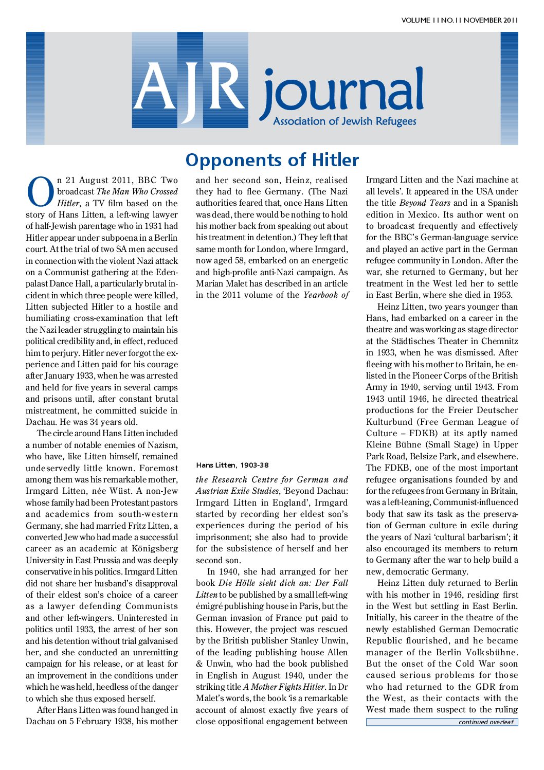 On 21 August 2011, BBC Two broadcast The Man Who Crossed Hitler, a TV film based on the story of Hans Litten, a left-wing lawyer of half-Jewish parentage who in 1931 had Hitler appear under subpoena in a Berlin court. At the trial of two SA men accused in connection with the violent Nazi attack on a Communist gathering at the Edenpalast Dance Hall, a particularly brutal incident in which three people were killed, Litten subjected Hitler to a hostile and humiliating cross-examination that left the Nazi leader struggling to maintain his political credibility and, in effect, reduced him to perjury. Hitler never forgot the experience and Litten paid for his courage after January 1933, when he was arrested and held for five years in several camps and prisons until, after constant brutal mistreatment, he committed suicide in Dachau. He was 34 years old. The circle around Hans Litten included a number of notable enemies of Nazism, who have, like Litten himself, remained undeservedly little known. Foremost among them was his remarkable mother, Irmgard Litten, née Wüst. A non-Jew whose family had been Protestant pastors and academics from south-western Germany, she had married Fritz Litten, a converted Jew who had made a successful career as an academic at Königsberg University in East Prussia and was deeply conservative in his politics. Irmgard Litten did not share her husband’s disapproval of their eldest son’s choice of a career as a lawyer defending Communists and other left-wingers. Uninterested in politics until 1933, the arrest of her son and his detention without trial galvanised her, and she conducted an unremitting campaign for his release, or at least for an improvement in the conditions under which he was held, heedless of the danger to which she thus exposed herself. After Hans Litten was found hanged in Dachau on 5 February 1938, his mother and her second son, Heinz, realised they had to flee Germany. (The Nazi authorities feared that, once Hans Litten was dead, there would be nothing to hold his mother back from speaking out about his treatment in detention.) They left that same month for London, where Irmgard, now aged 58, embarked on an energetic and high-profile anti-Nazi campaign. As Marian Malet has described in an article in the 2011 volume of the Yearbook of the Research Centre for German and Austrian Exile Studies, ‘Beyond Dachau: Irmgard Litten in England’, Irmgard started by recording her eldest son’s experiences during the period of his imprisonment; she also had to provide for the subsistence of herself and her second son. In 1940, she had arranged for her book Die Hölle sieht dich an: Der Fall Litten to be published by a small left-wing émigré publishing house in Paris, but the German invasion of France put paid to this. However, the project was rescued by the British publisher Stanley Unwin, of the leading publishing house Allen & Unwin, who had the book published in English in August 1940, under the striking title A Mother Fights Hitler. In Dr Malet’s words, the book ‘is a remarkable account of almost exactly five years of close oppositional engagement between Irmgard Litten and the Nazi machine at all levels’. It appeared in the USA under the title Beyond Tears and in a Spanish edition in Mexico. Its author went on to broadcast frequently and effectively for the BBC’s German-language service and played an active part in the German refugee community in London. After the war, she returned to Germany, but her treatment in the West led her to settle in East Berlin, where she died in 1953. Heinz Litten, two years younger than Hans, had embarked on a career in the theatre and was working as stage director at the Städtisches Theater in Chemnitz in 1933, when he was dismissed. After fleeing with his mother to Britain, he enlisted in the Pioneer Corps of the British Army in 1940, serving until 1943. From 1943 until 1946, he directed theatrical productions for the Freier Deutscher Kulturbund (Free German League of Culture – FDKB) at its aptly named Kleine Bühne (Small Stage) in Upper Park Road, Belsize Park, and elsewhere. The FDKB, one of the most important refugee organisations founded by and for the refugees from Germany in Britain, was a left-leaning, Communist-influenced body that saw its task as the preservation of German culture in exile during the years of Nazi ‘cultural barbarism’; it also encouraged its members to return to Germany after the war to help build a new, democratic Germany. Heinz Litten duly returned to Berlin with his mother in 1946, residing first in the West but settling in East Berlin. Initially, his career in the theatre of the newly established German Democratic Republic flourished, and he became manager of the Berlin Volksbühne. But the onset of the Cold War soon caused serious problems for those who had returned to the GDR from the West, as their contacts with the West made them suspect to the rulinggroup around Walter Ulbricht, who had spent the war in Moscow. Litten’s prospects of obtaining artistic work became increasingly restricted, and in August 1955 he committed suicide. Also featuring prominently in The Man Who Crossed Hitler was the lawyer, journalist and author Rudolf Olden (family name Oppenheim). Born in 1885, Olden had, like Hans Litten, acted as defence lawyer in trials with political overtones, most notably those involving the celebrated pacifist and left-wing journalist Carl von Ossietzky. Ossietzky, like Litten, was a particular target of the Nazis; arrested immediately after the Reichstag fire of 28 February 1933, he was detained until his death in 1938, despite having been awarded the Nobel Peace Prize for 1935. Olden, who had fled Germany for Prague on the night of the Reichstag fire, orchestrated a vigorous campaign to have Ossietzky, gravely ill with tuberculosis, freed. Olden settled in Britain, where he threw himself into anti-Nazi journalism. His elder brother Balder, also an author and 