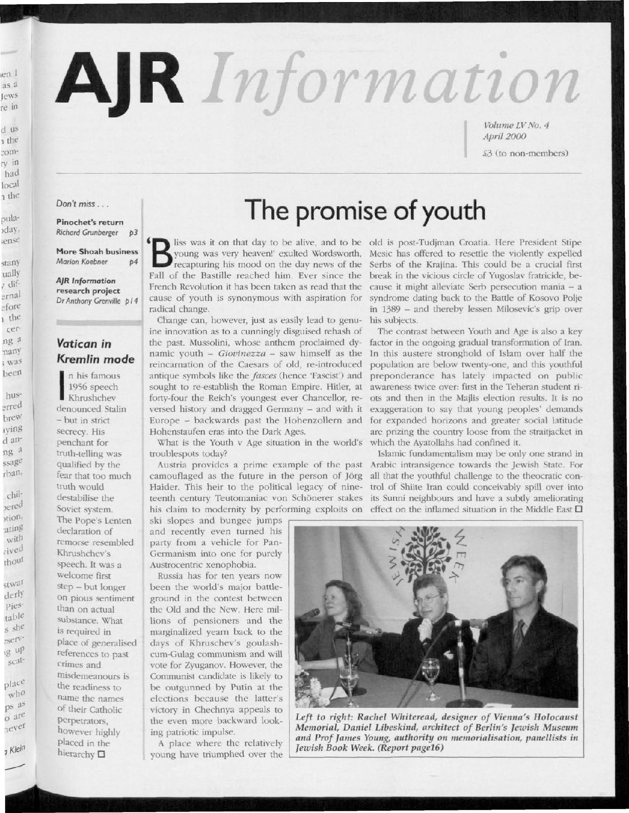 Reporting the Irving/ Lipstadt case Court 73 of the Royal Courts of Justice in the Strand has, since the beginning of this year, been the venue of a libel action brought by the controversial right-wing British historian David Irving against the American academic Professor Deborah Lipstadt. Irving alleges that in her book Denying the Holocaust: the Growing Assault on Truth and Memory, published in 1993, “Professor Lipstadt libelled him in referring to him as a Holocaust denier, a description that, he maintains, threatens his reputation as a historian. The proceedings have been held in open court with the public gallery always full to bursting. The press has regularly reported excerpts from the proceedings, both of the evidence and of judicial interventions Irving – skinhead in scholar’s robes In Kafka’s novella In the Penal Colony a monstrous machine inscribes each prisoner’s crime on his skin. The nightmare vision proved prophetic. Within a few years of the publication of the stor)’ the Nazis reversed the process: skin scarred by the circumcision knife became automatic proof of a ‘crime’ carrying the death penalty. The few who escaped felt ever after that they had been flayed and needed to grow new skin. This was a slow process ‘Unher held back by a series of traumatic shocks: the halfhearted pursuit of their tormentors, the courts’ leniency towards the latter, and, more recently, the burgeoning myth dubbed Holocaust denial. Holocaust denial is tantamount to •digging up the Shoah victims to drench their mortal remains in manure. For us it means having to live with the stench of neo-Nazi manure in our nostrils forever. With The Hon. Justice Gray’s dismissal of David Irving’s libel suit on 11 April, the rag-taggle army of Holocaust deniers lost the one ‘historian’ who conferred bogus respectability on their crazy fabrications. The judge ruled that Irving had ^or his own ideological reasons persistently and deliberately misrepresented and manipulated historical evidence. For the same reason he had portrayed Hider “1 an unwarrantedly favourable light principally in relation… to the treatment of the Jews.’ Deprived of his nimbus of a historical scholar Irving stands revealed (in the judge’s words) as ‘an active Holocaust denier, an antisemitic racist associated with rightwing extremists who promote neo-Nazism.’ The importance of this judgement is not to be underestimated. It is part of an irreversible trend that has already led to countries like Germany and Switzerland making Holocaust denial a criminal offence. This trend has, alas, not yet reached the Arab world. In recent weeks neither the Grand Mufti of Jerusalem nor the Damascus-based daily Tishrin have scrupled about charging Israel with inflating the number of Shoah victims for political purposes. In the same vein of obdurate denial of the truth, Irving himself reacted to the court’s judgement rather like Goering had done at Nuremberg. His totally unrepentant post-trial manner bespoke a confidence that wealthy backers in Germany (e.g. the publisher Gerhard Frey) and the USA will meet all his legal expenses. He also knows that the trial has given him an unprecedently high profile. Even so he, and similar Holocaust deniers, are the ultimate losers in this case, because henceforth no antisemite will be able to masquerade under the guise of disinterested scholarship.