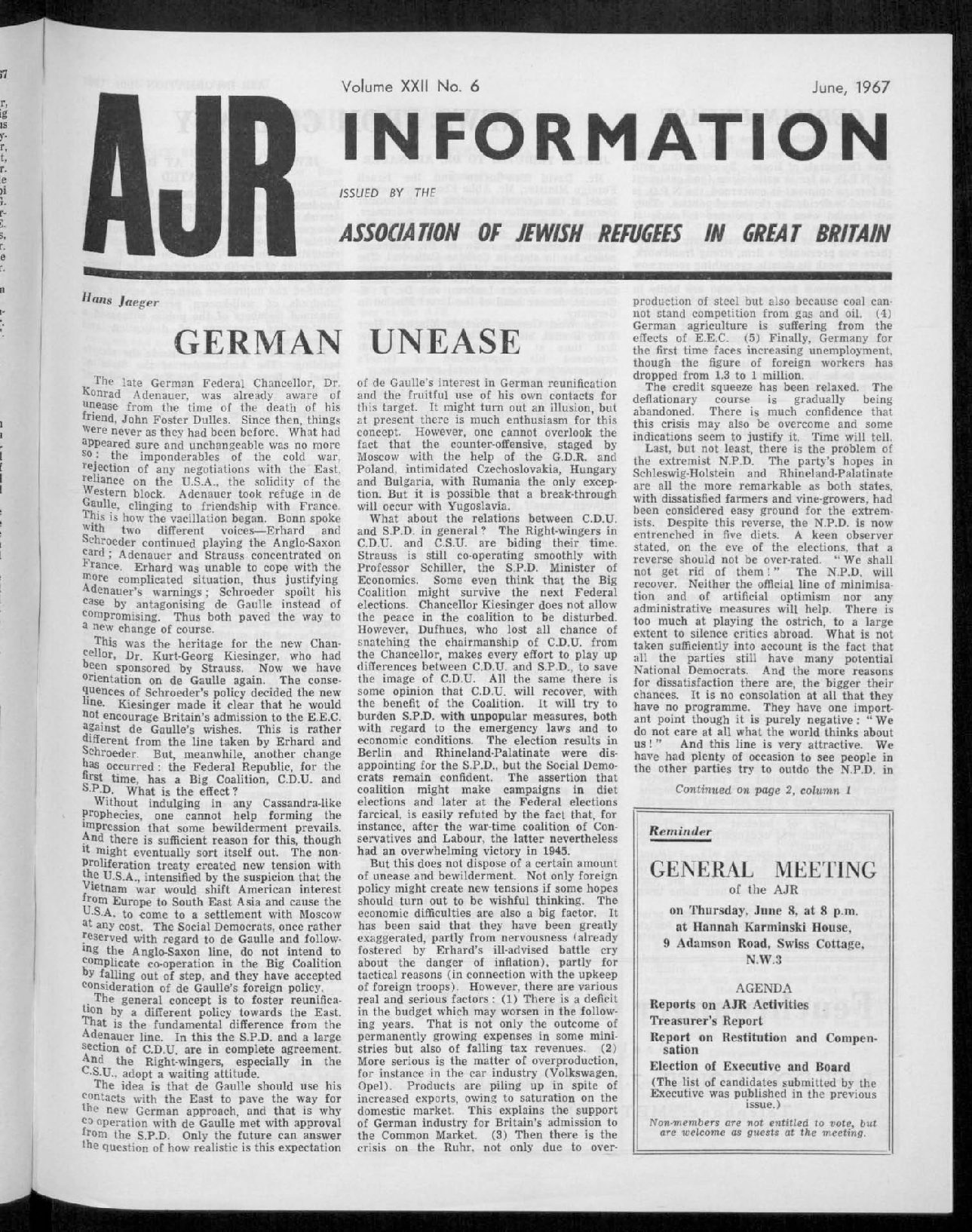 On April 13, the AJR arranged a gathering at Hannah Karminski House which, both with regard to the subject and to the average age of the audience, differed from the usual meetings of the AJR. The function was prompted by the publication of Karen Gershon’s book: ” We came as Children—A Collective Autobiography of Refugees ” (Gollancz 1966). Parts of the book had come as a surprise to some readers, because they seemed to indicate that integration was even limited for many of those who had spent their formative years in this country. The object of the meeting was an informal exchange of views on this subject among members of the younger generation. Only a limited number of people could be invited. They included some who had come over with children’s transports ; others had arrived with their parents or were born in this country. The proporition of those who had accepted the invitation was particularly high. After the audience had been welcomed by the Chairman of the AJR, Mr. A. S. Dresel, Mr. W. Rosenstock introduced Karen Gershon. He described her work as a most important contribution to the historiography of our community. One of the points to be discussed at the meeting, he stated, was, to what extent the reports published in the book were representative of the younger generation. Referring to certain difficulties some of the children had to go through during the first years after their arrival, he pointed out that the older refugees were not entirely free of guilt, because they could probably have done more for those refugee children who had left their own families behind. Karen Gershon recounted personal experiences which, in her view, showed that quite a few former refugees of her age group were particularly vulnerable and inclined to attribute any difficulties they might encounter to their foreign origin, especially as far as they had still retained their foreign accent. The proper equilibrium, she maintained, could only be achieved by the generation of their children. After her deliberately short introduction Karen Gershon answered a variety of questions raised by the audience in the course of a most vivid discussion. Was integration easier for those who had stayed together in groups or special refugee schools and who could therefore lean on each other, or for those who were dispersed and got to know their environment from the very beginning? Was it easier for those who had been too young to strike roots abroad prior to their emigration or for the older ones who were better equipped to fend for themselves? Some referred to the ” scars ” they had to live with, others described the initial difficulties as a challenge which had strengthened their personalities. One speaker warned against considering the difference of background as an impediment; a country like England had always respected members of minority groups who retained their characteristics. It was also stated that often the choice of the marriage partner had been influenced by the refugee status, though in opposite directions: some married fellow refugees because the common destiny facilitated mutual understanding; others had married English Gentiles because — consciously or sub-consciously — they expected that this would make final integration easier for them. Several speakers stressed that the problem was not limited to the dichotomy between the Continental origin and the English environment, but that the Jewish element also played a most important part, not only for those who wanted to retain their Jewish identity but also, as we know only too well from our experience in Germany, for those who tried to escape it. There was not sufficient time to consider this aspect in greater detail. It involves the complicated question of the substance of Jewishness, a vexing problem especially for those whose religious leanings are weak or even non-existent and who do not consider themselves as Israelis abroad either. It might be worthwhile to devote a special discussion to this question which, as we know, is particularly on the minds of many younger people. The paramount impression of the gathering was that most members of the next generation have achieved a happy equilibrium between the values of their background and of their environment. Those who considered their Continental birth or parentage as a handicap were definitely in the minority. On the other hand, almost all speakers, including those already born in this country, confirmed that their origin put them into a specific position. However, they did not consider this as a misfortune but, on the contrary, as an enrichment of their lives. It opened vistas for them, which were not as easily accessible to others, and they realised that they would render a disservice to themselves if they tried to suppress any of the elements by which their personalities had been moulded. All those present felt that the evening had served a useful purpose. It was therefore a step in the right direction on the part of the AJR that it provided a platform for this ” teach-in”. It would be appreciated if any readers who are of the opinion that the gathering should be followed up by further occasional meetings, at which the questions under discussion could be enlarged upon, would get in touch with the AJR. It is hoped that the feeling of belonging which became evident at the meeting will also be beneficial for the general work of the AJB. though this was not the actual object of the function. The AJR will have to cope with many essential tasks for a long time to come. However, those who are now in charge have gradually to be replaced by younger people. A rejuvenation of the rank-and-file and, above all, of the group of active fellow-workers is therefore increasingly important. Any offers of support and help will be greatly welcomed.