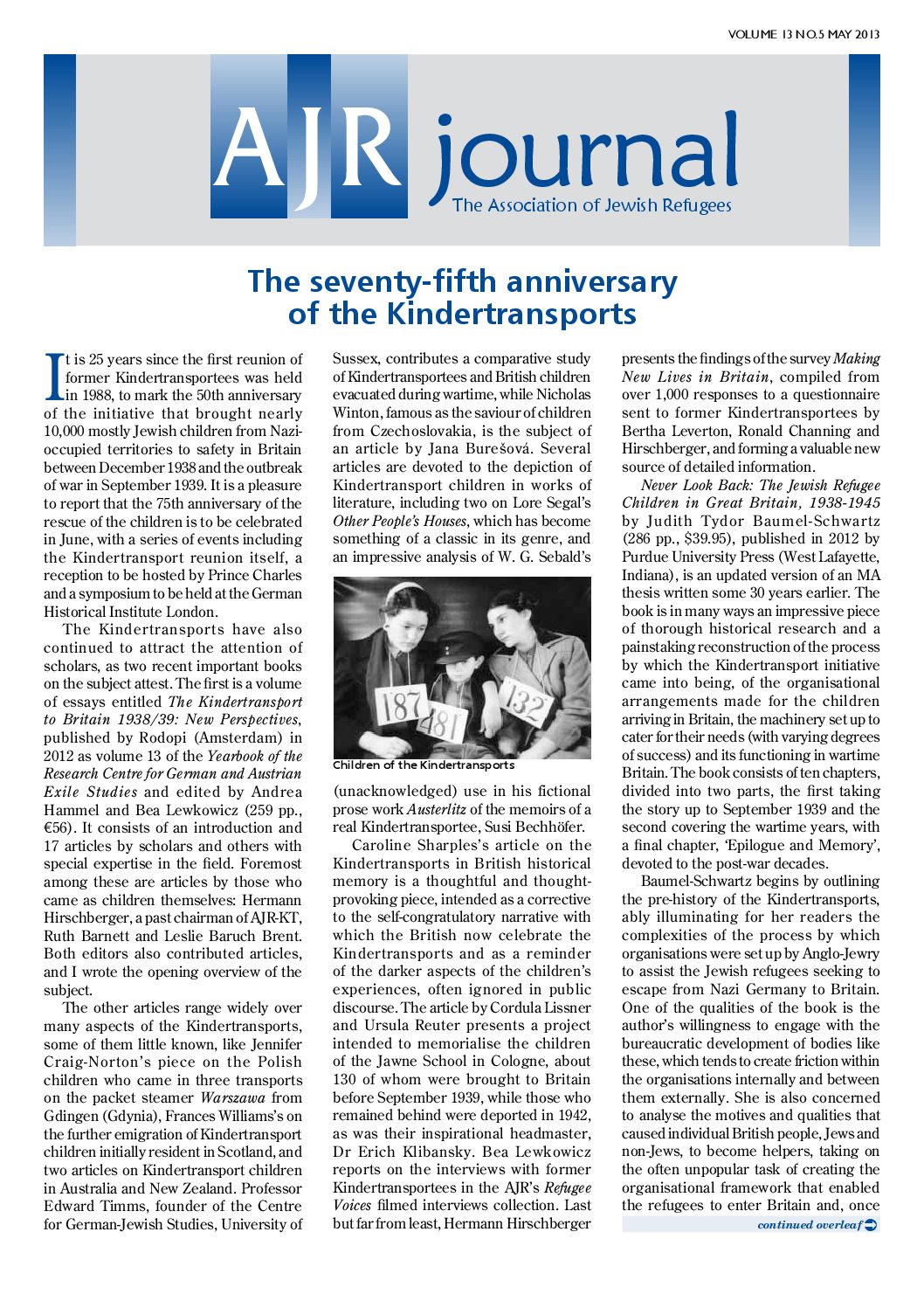 It is 25 years since the first reunion of former Kindertransportees was held in 1988, to mark the 50th anniversary of the initiative that brought nearly 10,000 mostly Jewish children from Nazioccupied territories to safety in Britain between December 1938 and the outbreak of war in September 1939. It is a pleasure to report that the 75th anniversary of the rescue of the children is to be celebrated in June, with a series of events including the Kindertransport reunion itself, a reception to be hosted by Prince Charles and a symposium to be held at the German Historical Institute London. The Kindertransports have also continued to attract the attention of scholars, as two recent important books on the subject attest. The first is a volume of essays entitled The Kindertransport to Britain 1938/39: New Perspectives, published by Rodopi (Amsterdam) in 2012 as volume 13 of the Yearbook of the Research Centre for German and Austrian Exile Studies and edited by Andrea Hammel and Bea Lewkowicz (259 pp., €56). It consists of an introduction and 17 articles by scholars and others with special expertise in the field. Foremost among these are articles by those who came as children themselves: Hermann Hirschberger, a past chairman of AJR-KT, Ruth Barnett and Leslie Baruch Brent. Both editors also contributed articles, and I wrote the opening overview of the subject. The other articles range widely over many aspects of the Kindertransports, some of them little known, like Jennifer Craig-Norton’s piece on the Polish children who came in three transports on the packet steamer Warszawa from Gdingen (Gdynia), Frances Williams’s on the further emigration of Kindertransport children initially resident in Scotland, and two articles on Kindertransport children in Australia and New Zealand. Professor Edward Timms, founder of the Centre for German-Jewish Studies, University of Sussex, contributes a comparative study of Kindertransportees and British children evacuated during wartime, while Nicholas Winton, famous as the saviour of children from Czechoslovakia, is the subject of an article by Jana Burešová. Several articles are devoted to the depiction of Kindertransport children in works of literature, including two on Lore Segal’s Other People’s Houses, which has become something of a classic in its genre, and an impressive analysis of W. G. Sebald’s (unacknowledged) use in his fictional prose work Austerlitz of the memoirs of a real Kindertransportee, Susi Bechhöfer. Caroline Sharples’s article on the Kindertransports in British historical memory is a thoughtful and thoughtprovoking piece, intended as a corrective to the self-congratulatory narrative with which the British now celebrate the Kindertransports and as a reminder of the darker aspects of the children’s experiences, often ignored in public discourse. The article by Cordula Lissner and Ursula Reuter presents a project intended to memorialise the children of the Jawne School in Cologne, about 130 of whom were brought to Britain before September 1939, while those who remained behind were deported in 1942, as was their inspirational headmaster, Dr Erich Klibansky. Bea Lewkowicz reports on the interviews with former Kindertransportees in the AJR’s Refugee Voices filmed interviews collection. Last but far from least, Hermann Hirschberger presents the findings of the survey Making New Lives in Britain, compiled from over 1,000 responses to a questionnaire sent to former Kindertransportees by Bertha Leverton, Ronald Channing and Hirschberger, and forming a valuable new source of detailed information. Never Look Back: The Jewish Refugee Children in Great Britain, 1938-1945 by Judith Tydor Baumel-Schwartz (286 pp., $39.95), published in 2012 by Purdue University Press (West Lafayette, Indiana), is an updated version of an MA thesis written some 30 years earlier. The book is in many ways an impressive piece of thorough historical research and a painstaking reconstruction of the process by which the Kindertransport initiative came into being, of the organisational arrangements made for the children arriving in Britain, the machinery set up to cater for their needs (with varying degrees of success) and its functioning in wartime Britain. The book consists of ten chapters, divided into two parts, the first taking the story up to September 1939 and the second covering the wartime years, with a final chapter, ‘Epilogue and Memory’, devoted to the post-war decades. Baumel-Schwartz begins by outlining the pre-history of the Kindertransports, ably illuminating for her readers the complexities of the process by which organisations were set up by Anglo-Jewry to assist the Jewish refugees seeking to escape from Nazi Germany to Britain. One of the qualities of the book is the author’s willingness to engage with the bureaucratic development of bodies like these, which tends to create friction within the organisations internally and between them externally. She is also concerned to analyse the motives and qualities that caused individual British people, Jews and non-Jews, to become helpers, taking on the often unpopular task of creating the organisational framework that enabled the refugees to enter Britain and, once admitted, provided them with the basic necessities of life. It is gratifying to see recognition accorded to figures like Dorothy Hardisty, the remarkable but largely forgotten woman who in 1939 took over the key position of Executive Director of the Refugee Children’s Movement, the most important of the organisations set up to cater for the needs of the Kindertransport children. While acknowledging the exceptional contribution made by the Quakers to the reception of the children, Baumel-Schwartz devotes much of this section of her book to the Jewish helpers and the organisations they founded. She investigates the Chief Rabbi’s Religious Emergency Council and the role played in it by the charismatic but divisive Rabbi Solomon Scho