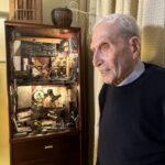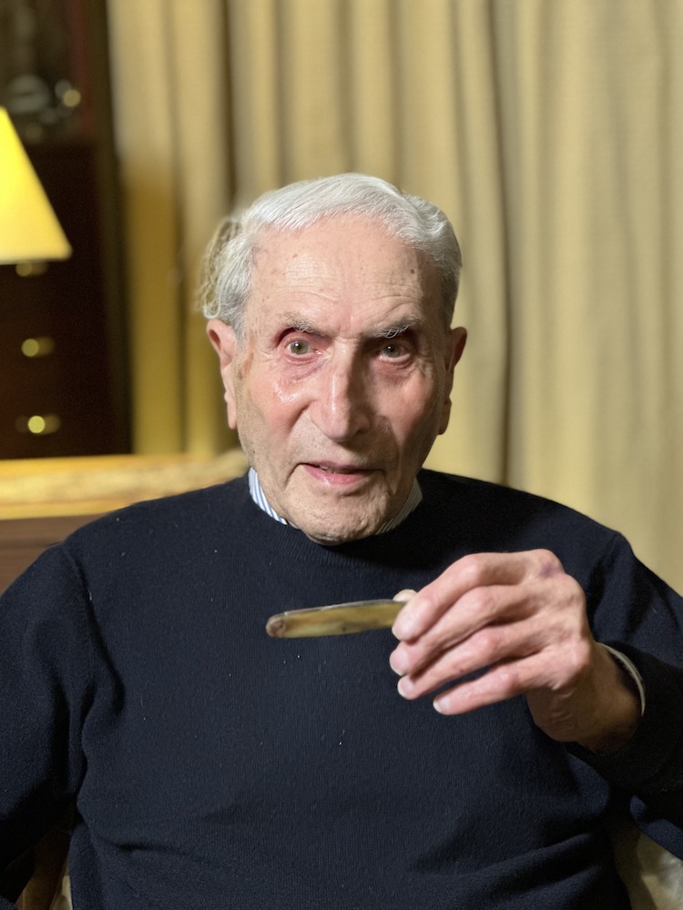 AL: “AL holding the pen knife he clutched the day he was chased out of his school in Esslingen 11 years old and hiding in the woods. “I clutched it for courage and kept it ever since”.