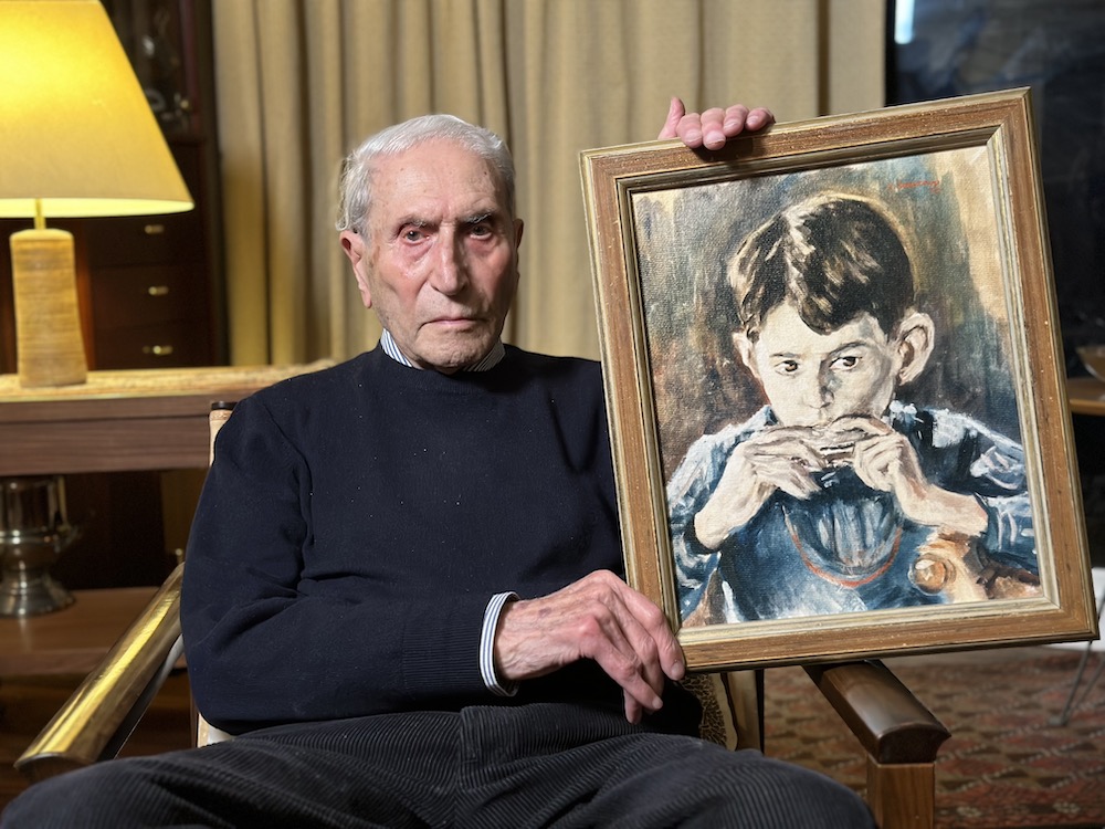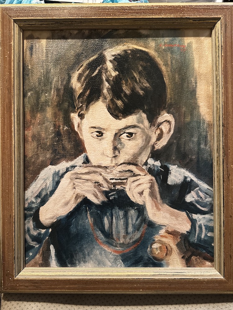 AL: 2024 holding a painting by Ludwig Schwerin showing him as a five year old playing the harmonica