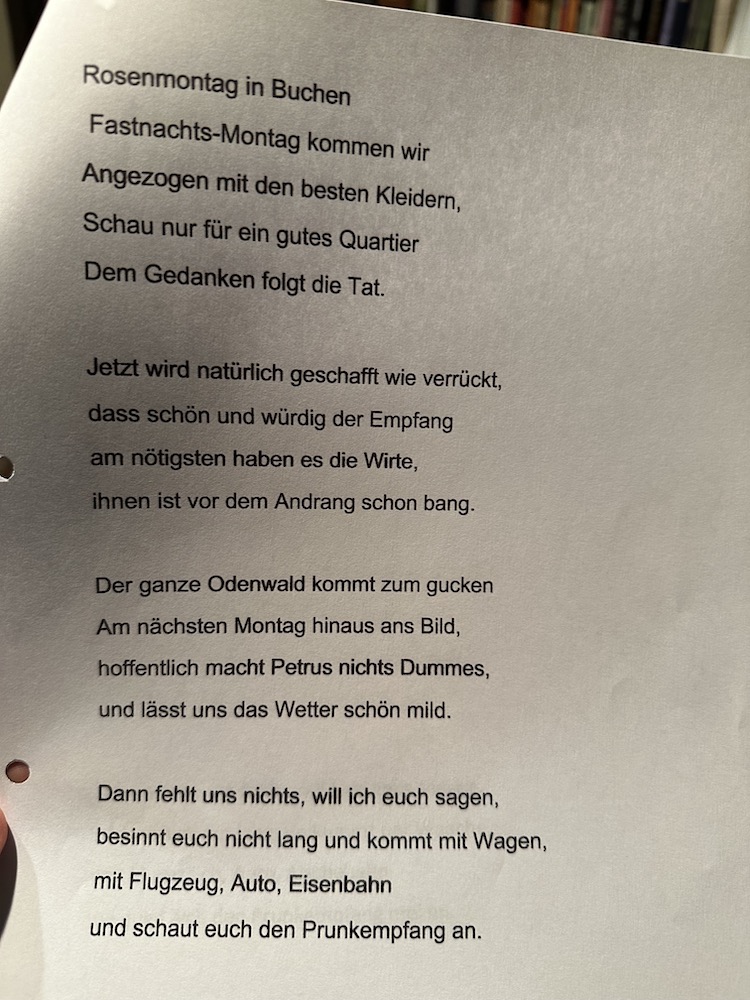 AL: Carneval "poem" written by his mother Susi Levy in Buchen 1928 which he reads in his video testimony in Buchener vernacular