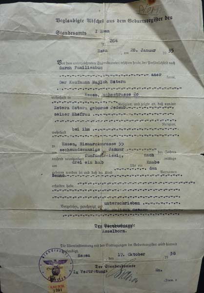 Benno Stern was born in 1935 in Essen, where his parents owned a wholesale business with material for men suits. His parents had come from Poland to Germany and were stateless. They lived in the Hachestrasse, near the main railway station. Benno does only remember fragments from Essen. They lived a very observant Jewish live. He does remember vaguely his journey to the UK, where he was one of the few people who did not get ill on the boat. His mother had an uncle in Ealing who had arranged the family’s emigration. He travelled with his father and older sister to the UK, while his mother travelled one week later. The SS came looking for his father and threatened to arrest his mother. The family settled in Ealing and Benno started going to a local primary school. Benno stayed throughout the war in London, while his sister was evacuated. Due to a raptured appendix, he almost spent a year in hospital in 1943. His parents opened the Parisian Dressmaking Company in London while he studied to become a dentist. He married in 1958, settled in Northwood and had two children. He had his own dental practice in Hayes for more than 40 years. He has visited his former home in Essen and now lives in Bushey Heath with his wife.