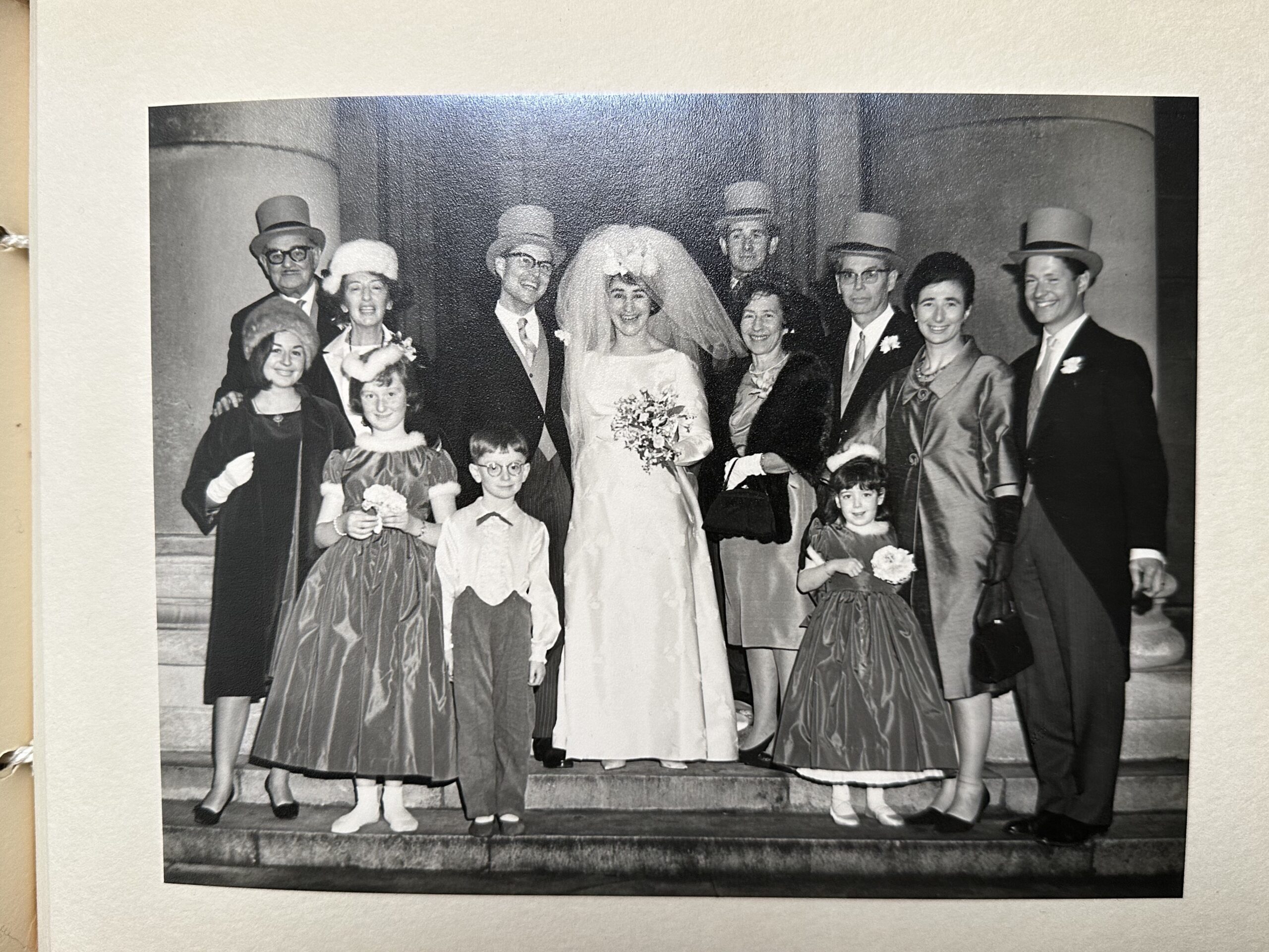 BN: Wedding day with Peter Newman in 1964 with her parents next to Peter and his sister in front of them. And on the right her parents-in-law and her brother-in-law with his wife