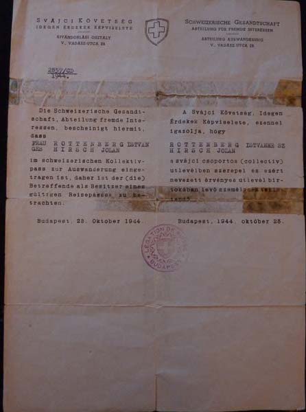 EB: Wartime Swiss protection letter. "This is a protection letter issued by the Swiss embassy to my mother. It is a group protection certificate to try to prove that she was a Swiss citizen