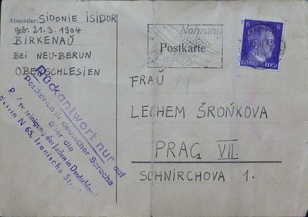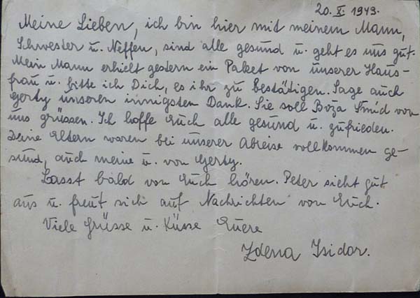 EC: Back of postcard from Aunt Zdena in Auschwitz. "This is the translation of the postcard. It starts off with the words: “My dear ones