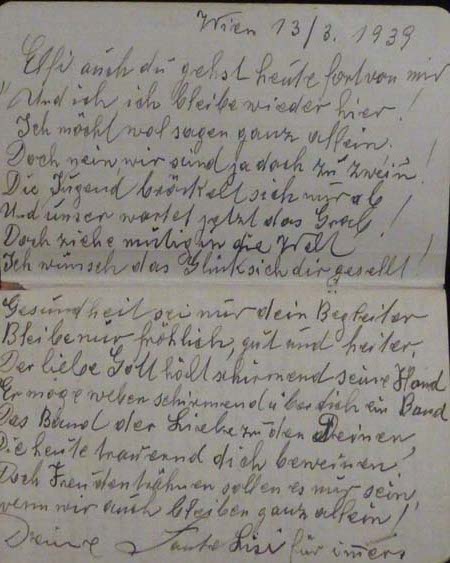 On 8 November 1938, on the eve of what became Kristallnacht, Eve was on the way back home when she was warned not to go home. The Nazis had looted their flat and, with many others, they were taken to the local synagogue. There they were informed that their flat was requisitioned and that they had to leave in a few hours. They moved to a small flat in the Obere Donaustrasse. A cousin in Shanghai had organized Chinese visas for the parents and at the same time Eve’s name was put down for a Kindertransport. Eve was reluctant to go but her mother told her that she had to. Her great-aunt gave her a little book and wrote a leaving poem in it (which Eve still has – this booklet became her diary in the UK).