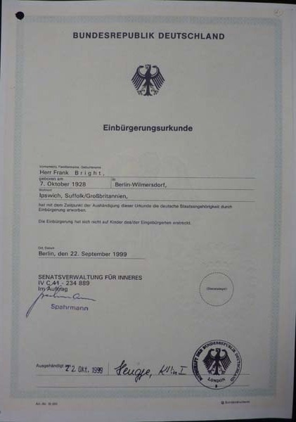 Frank Bright/Brichta described himself as ‘vaguely Jewish’, indicating both his attitude towards religion, and his societal background. Nevertheless, he is strongly aware of being a survivor, and has endeavoured to trace those he knew in different circumstances, establishing their death or survival. He was born in 1928 in Berlin (Wilmersdorf), where his father joined Sigmund Pinkas and was ultimately the manager of a private Jewish bank. Whilst Hermann Brichta was originally from Vikos u Kyjova in Moravia, Czech Republic (formerly Czechoslovakia), his wife, Toni Brichta (nee Wasservogel), was a Berlin-born (Kreutzberg) steno-typist and linguist (German, English and French).
