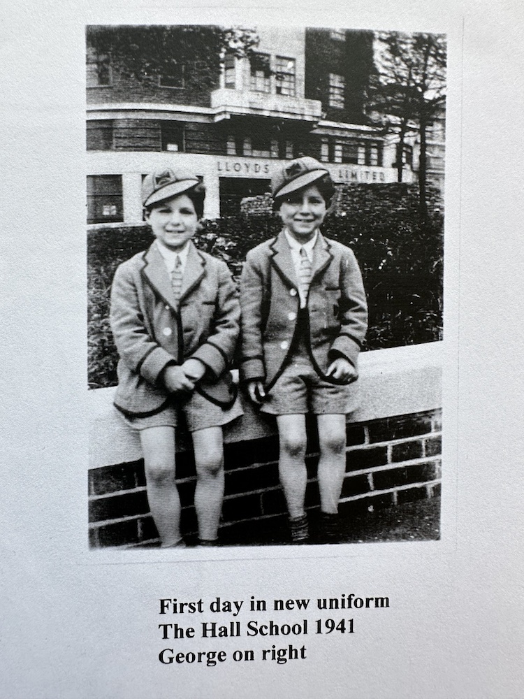 On their arrival at Liverpool Street station, the Central British Fund picked the family up and put them in a hotel for two weeks. Shortly after, they moved to a room in Chiswick, where George and Peter were given places at Chiswick and Bedford Park High school. The family later moved to Eastbourne. From there, George’s father was arrested and interned on the Isle of Man. George, Peter and his mother moved back to London, as ‘enemy aliens’ were not allowed to stay on the coast. They lived in a room in Chalk Farm and spent every night in Tottenham Court Road Underground Station because of the Blitz. They boys first went to a local primary school where they were bullied as ‘Germans’ but then the Hall School in Swiss Cottage offered them two places for one school fee.