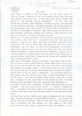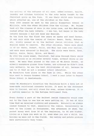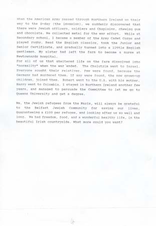 He and his older sister came to England on a Kindertransport on 20 June 1939. At Liverpool St they were picked up to be taken to a Refugee Farm in Millisle, Northern Ireland, due to a friend of his parents who was there. On the farm were 30 Chalutzim from Bachad, about 40 older refugees and c 12 children. They played and helped until Jan 1940 when they were sent to the Village School. Then Gerald attended Regent House School, Newtownards, Co Down. His spoke at length about life at this time. His sister was not on the farm long since she was old enough to go to work.