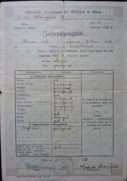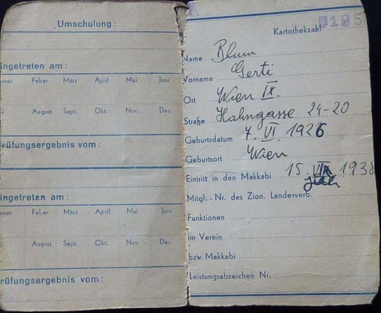 Gerti Baruch nee Gerti Blum was born in 1926 in Vienna. Her parents Klara and David Blum had come from Czernowitz to Vienna, where they settled in the 9th district. Her mother was a couture dressmaker and her father was an agent for a metal company. She had a six years older sister called Lilly. After the Anschluss the father lost his job and had vocational training how to make leather bags. On Kristallnacht the father was arrested and sent to Dachau. Gerti’s mother arranged a visa to Palestine for him and after his release he left for Palestine. Gerti does not remember the details but thinks he went on a boat from Marseille to Haifa.
