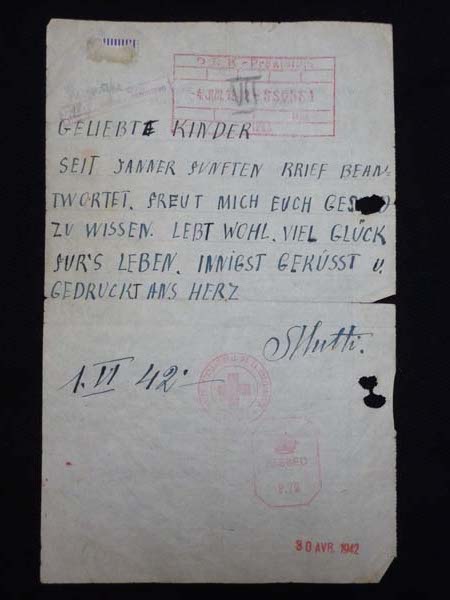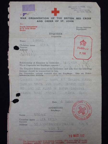 Harry Bibring retained a number of Red Cross communications from his mother, received until June 1942. He maintained that Jewish refugees in Britain at that time knew nothing of the concentration camps. He later retrieved his father’s pocket-watch and jewellery Lea Bibring had left with an honest Aryan woman for safe-keeping in Vienna.