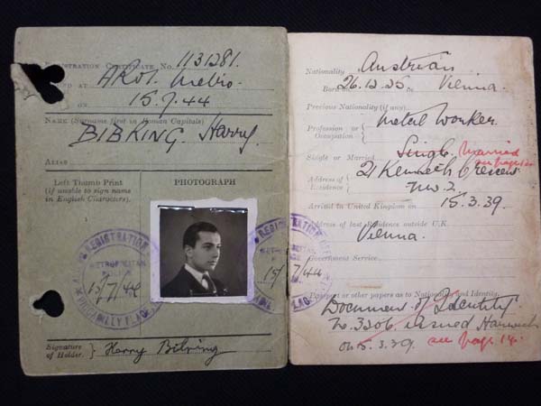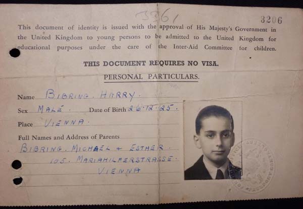 This experience prompted Michael Bibring’s thwarted plan to emigrate to Shanghai. Turning then to the Central British Fund (now World Jewish Relief), he arranged for both children to join the Kindertransport to Britain, departing on 30 March 1939. Harry’s Kindertransport label was No. 3361, Gerta’s No. 3360. ‘The scene was horrible, 200-300 children saying their farewells’. Crossing the border into Holland ‘was the happiest day. Dutch people offered sweets and toys’. Arriving at London’s Liverpool Street Station ‘was a miracle!’ Harry Bibring was very proud of how ‘the British government had acted quickly when it was necessary’.