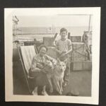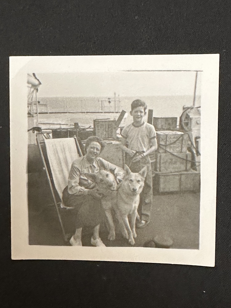 JW: "On the Edinburgh Castle on our way to Cape Town and then Southern Rhodesia with my Auntie Paula in the deckchair and our two Alsatians