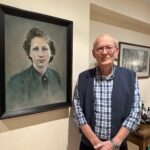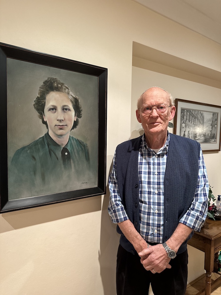JW: Standing next to a painting of his mother which copies a photo taken of her in Mechelen transit camp