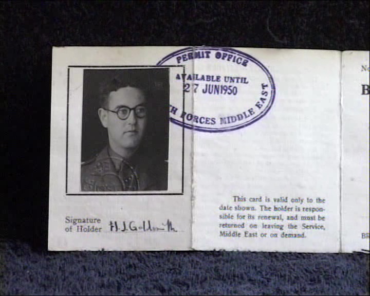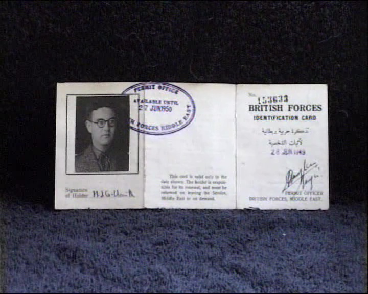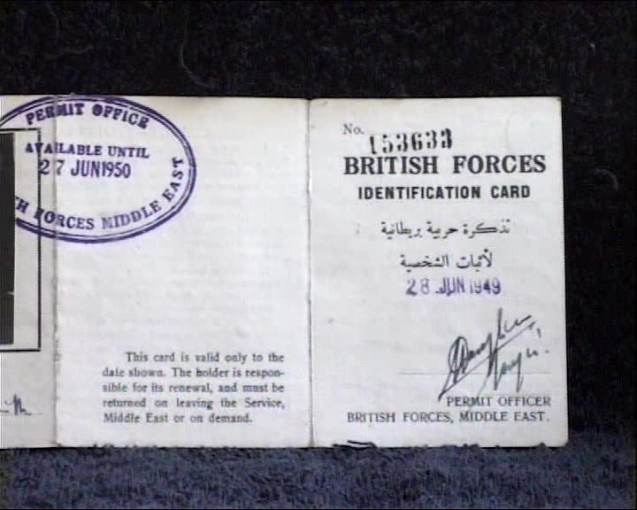 JG: "This is my identity pass when I was based in the RAMC in the Middle East dated June 1949."