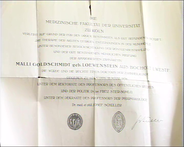 He [stepfather Alfred Meyer] had quite strong left wing political views, a lot of girlfriends. He was a wonderful dentist with a high reputation & a good practice. Now the local Gauleiter was also a dentist in the same place, with a poor practice. They were gunning for him. He was kidnapped from the house of another Jewish dentist in Düsseldorf, my mother was there, bundled into a car & would never have been seen again except that they'd attached a book press to his body. He was shot in the car, they attached a book press to his body & they dumped him in a huge water reservoir, the book press became detached & he floated to the surface & that is how he was found. Now, look: the Judiciary were already Nazified [in 1933]. Nobody was punished. My mother knew who it was, at least who the instigator was, but he was never punished. As a result of this my mother decided to leave Germany, although she was in so-called protective police custody. She was claustrophobic anyway, it was terrible for her.