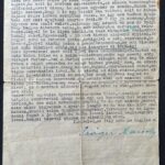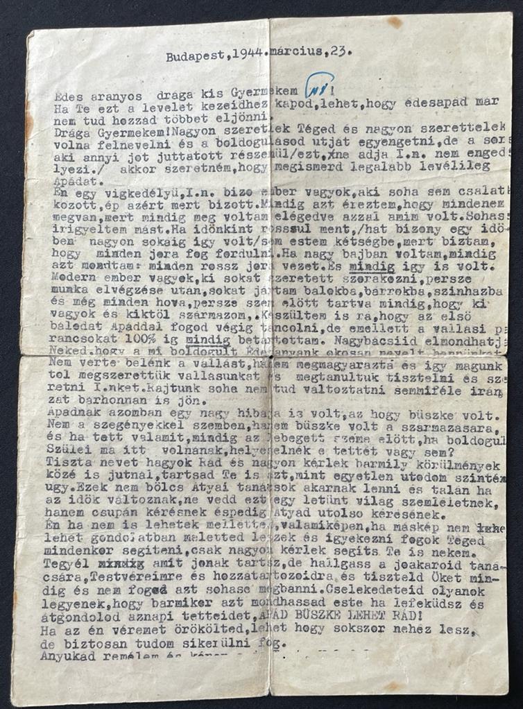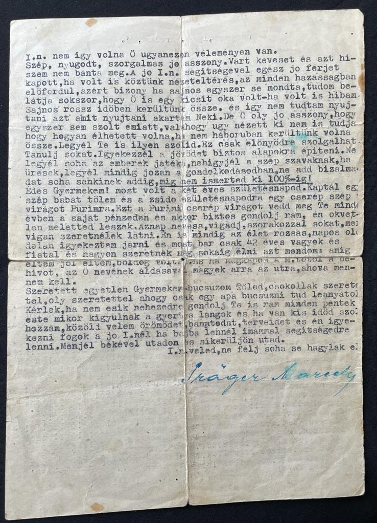 Budapest, March 23rd, 1944. ‘My dear darling little child, when you get this letter in your hands it’s possible your daddy cannot come back to you anymore. My darling little child I would have very much loved to bring you up and would have liked to straighten your ways and your happiness. But fate which gave me so much in life over the years cannot give me that. In that case, I would at least like – your father would like to get you to know your father in a letter... Darling little child, now it was you second birthday and you got from me a nice big doll. Every year for sure laugh on that day, have a lovely time, and enjoy yourself, because I want you to be happy. I always walked on the sunny side of life, and now I’m forty-two years old and still too young to die, but I can say while I lived, I lived well. If I must go, I will go with Hashem’s name. My beloved only child, I say goodbye to you. I kiss you with much love as a father can say goodbye to a child.'