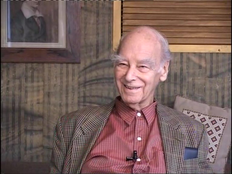 One morning Kurt Schwitters arrived in Hutchinson and Richard Friedenthal, the editor of the Knaurs, the Knaur Lexikon, he recognised him, and because I was in charge of the artists, he called me over and he said, ‘That is the notorious Kurt Schwitters’ and I knew of him, because of the degenerate art exhibition, there was…his abstracts, collages, were deliberately hung like this and they were in the section ‘Total Verrückt’. And there’s a photo of Hitler standing in front of them, grinning inanely at this particular picture. That picture has disappeared, as a matter of fact, that doesn’t exist. But Schwitters had then, you know he wasn’t Jewish or anything, he wasn’t political or anything, and he had always gone to Norway over summer for some months, so he went to Norway and stayed, after the degenerate art exhibition, together with his son. And his wife stayed on in Germany, in Hanover, and came occasionally, his mother too, to visit him and then his permit had expired, resident, in Holland, in Norway, and he after quite some extraordinary experiences on his travels, he travelled with two white mice always in his pocket, and the Norwegian partisans caught him and said that he was a Nazi spreading bacterial warfare (laughs) – these two white mice. And then he declaimed one of his poems, he said it’s so mad, it can’t have been him. But he was detained in northern Norway in a school, the school had a workshop. There were various others, Ernst Blensdorf, who was a sculptor, who came also to Hutchinson, and they thought one of them was a German Nazi spy – he didn’t talk and so – and suddenly, Schwitters was in the workshop and this man was there too and he killed himself, committed suicide with a chainsaw. Now that is really a very nasty way to kill yourself. In two halves or God knows what, and this French poet, who was here, he says Schwitters’ whole aspect of life was changed by this experience. I’m not sure this is true, but in any case it’s not a very nice experience, with a chainsaw. Anyway, they arrived then, he arrived then in Hutchinson and I showed him around and then he talked about the many interesting faces and about the landscape and I said, ‘Look, he’s a Dadaist, you know, what’s going on?’ and then very soon he said – he was a very good business man as a matter of fact – he found very eminent people, Rudolf Olden for instance, and painted their portraits free of charge and did an exhibition, and of course all the minor mortals wanted to be painted by him as well. So, contrary to all other artists, who said, if they did your portrait, ‘Look try to give me something else’ or something like it, he had a range of charges – five pounds, head and shoulders and hands; four pounds, head and shoulders, arms but no hands and three pounds, head and shoulders only. My portrait is head and shoulders only, but three pounds at the time was an awful lot of money and five pounds was really like a couple of hundred pounds nowadays. I didn’t pay for mine, because I had an office in the camp administrative building and I let him have it occasionally over lunch, so that he could do some portraits there and one day I came back from lunch and on my desk, amongst all my papers, stood a naked man and he was – completely blue legs and a very red face where he was standing next to the electric fire and in the corner Schwitters was sitting painting him in red and in blue. And I said, ‘Look, Schwitters, that I really can’t have, you know. I don’t like people standing naked in the middle of all my papers’. So he said, ‘I’ll paint your portrait’. This way I got my portrait.