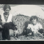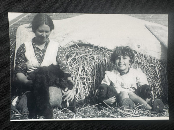 LL: Mrs Griffiths from Ty Gwyn Farm in Bull Bay where Lia and her guardian used to collect their milk. Lia is hugging the sheepdog's puppies