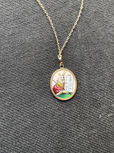 LL. The only piece of jewellery Lia brought when she came to England in 1939. It is Moses giving the Law on Mount Sinai. Given to her by her parents "to make sure she knew she was Jewish".