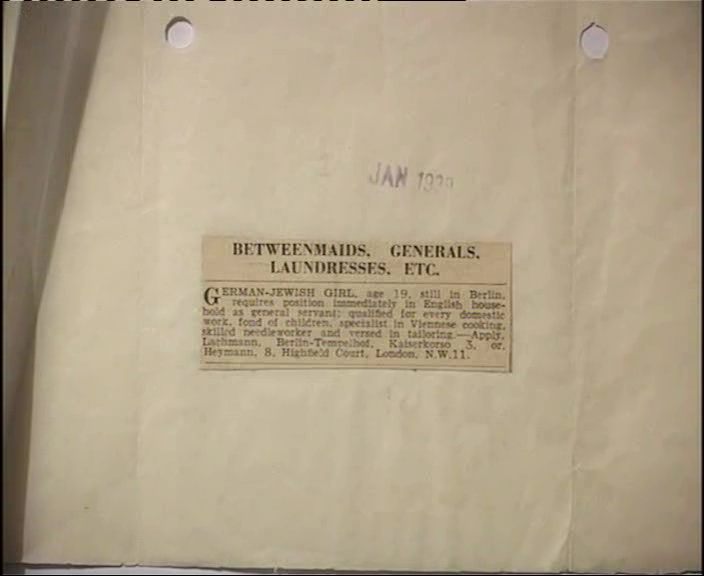 Lillian Heyman, nee Liselotte Rosl Lachmann, was born 1919 in Berlin. She left school at 16 to train as a window dresser and worked in the big department shop ‘Kaufhaus N. Israel’. Her future husband Ernst Heyman (Ernest Heyman) who had been in the UK since 1936 put an advertisement for a domestic position in the papers (which she reads out at the end of the interview). Lillian came to the UK in February 1939 on a domestic visa. She later found work as a window dresser. She now lives in London and has two children.