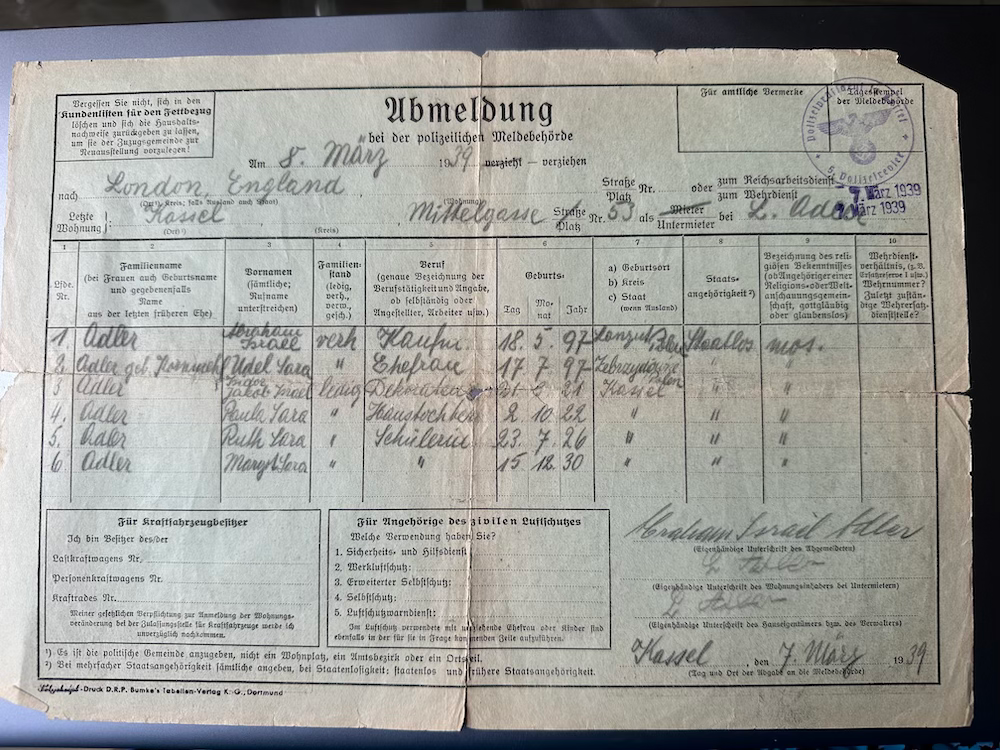 During the November Pogrom (Kristallnacht), their shop was looted, a brick was thrown through their living room window and worse was only prevented by a neighbour shouting “the Adlers don’t live there”. Her father was taken to Buchenwald and efforts to emigrate which had been started already, had to be redoubled. Her older brother went on a Kindertransport to the USA. Her mother’s brother-in-law in Paris who was a well-to-do furrier with connections to the British Consulate helped arrange their emigration to London, where her father was “supposed to teach religion.”