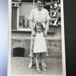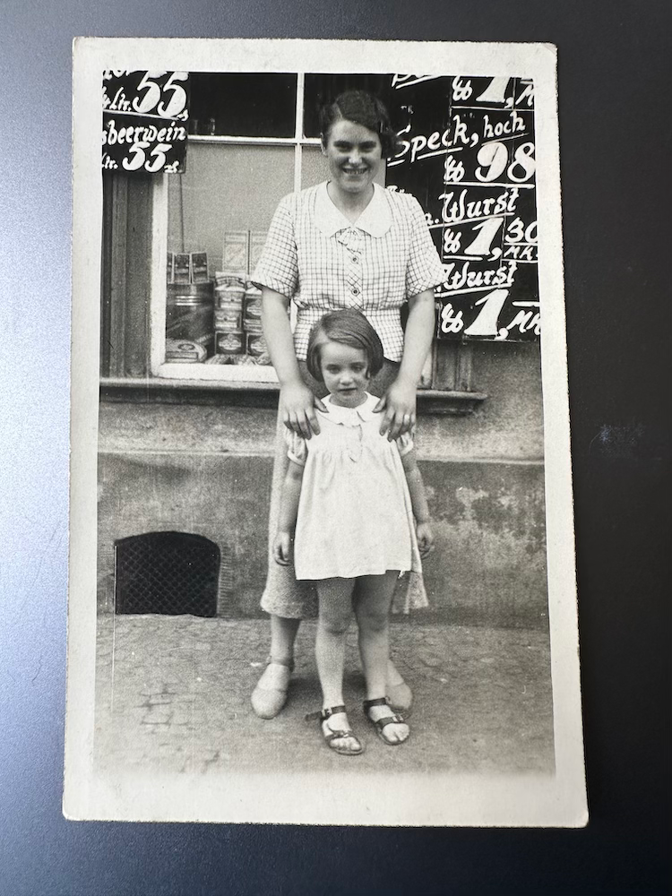 MH: "One of my nursemaids and myself in front of the dairy next door to our business." Kassel in 1934