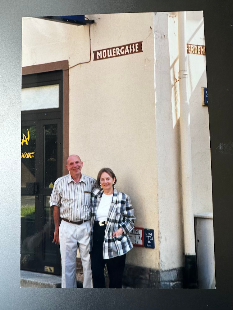 MH: With her husband in Kassel during her first return visit outside the building where she was born