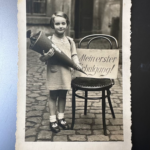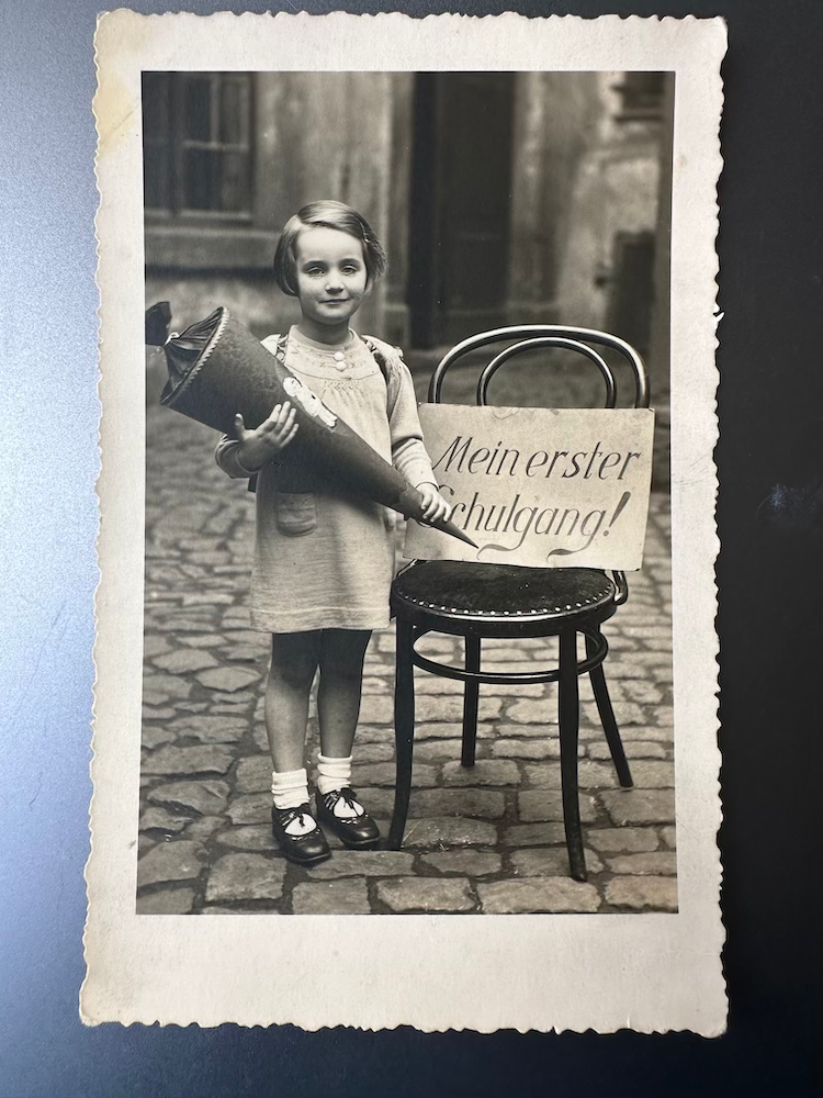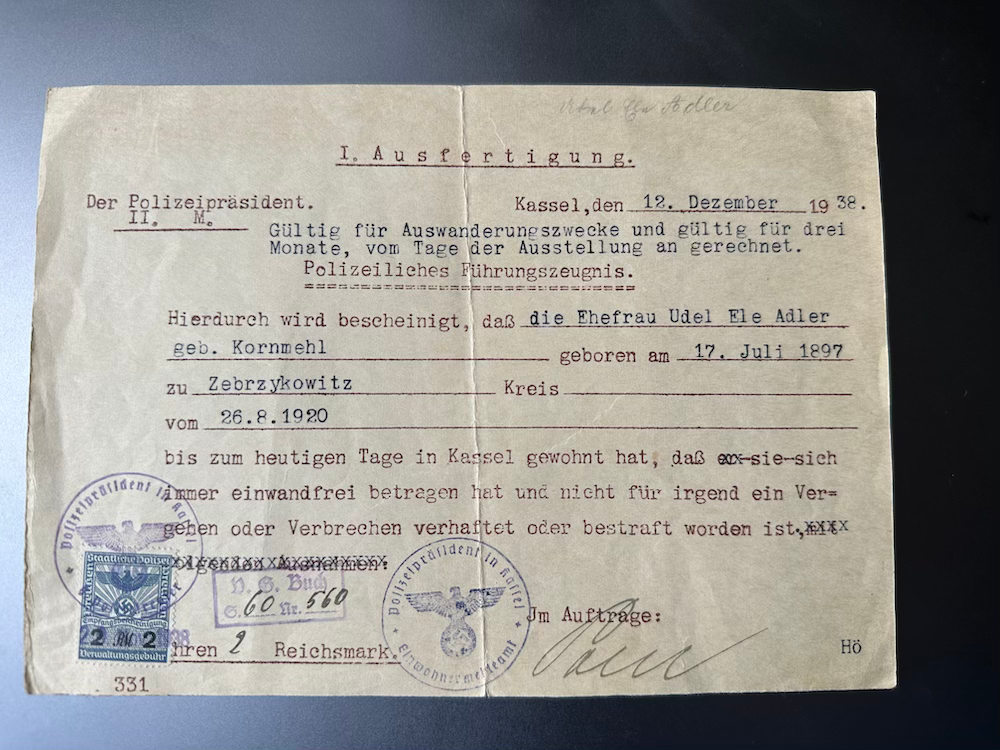 Margot Harris, born Margot Adler in Kassel in 1930, was the youngest of five children. Her parents Rosa Adele née Kornmehl and Abraham Adler both came from Poland and their marriage was arranged. She remembers a very happy and protected childhood in Kassel. Her older siblings took her along to their activities and she learnt swimming in the river Fulda, went sledding in winter and started school in 1936. Her father sold menswear in his shop called “Adler’s Kleiderbörse” and they lived above the shop in Müllergasse/ Ecke Pferdemarkt. They were an observant family and she remembers her mother’s excellent cooking and baking for Shabbos, Pesach and the other high holidays.