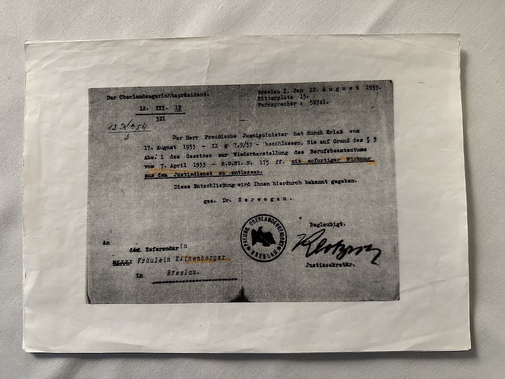 MS: Letter from the Highger Regional Court Breslau to her father; he was no longer allowed to practice law because he was not Aryan (according to a law regarding the registration of lawyers from 7th April 1933)
