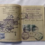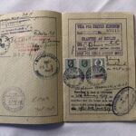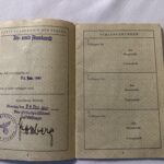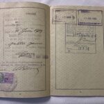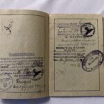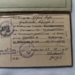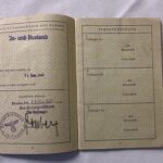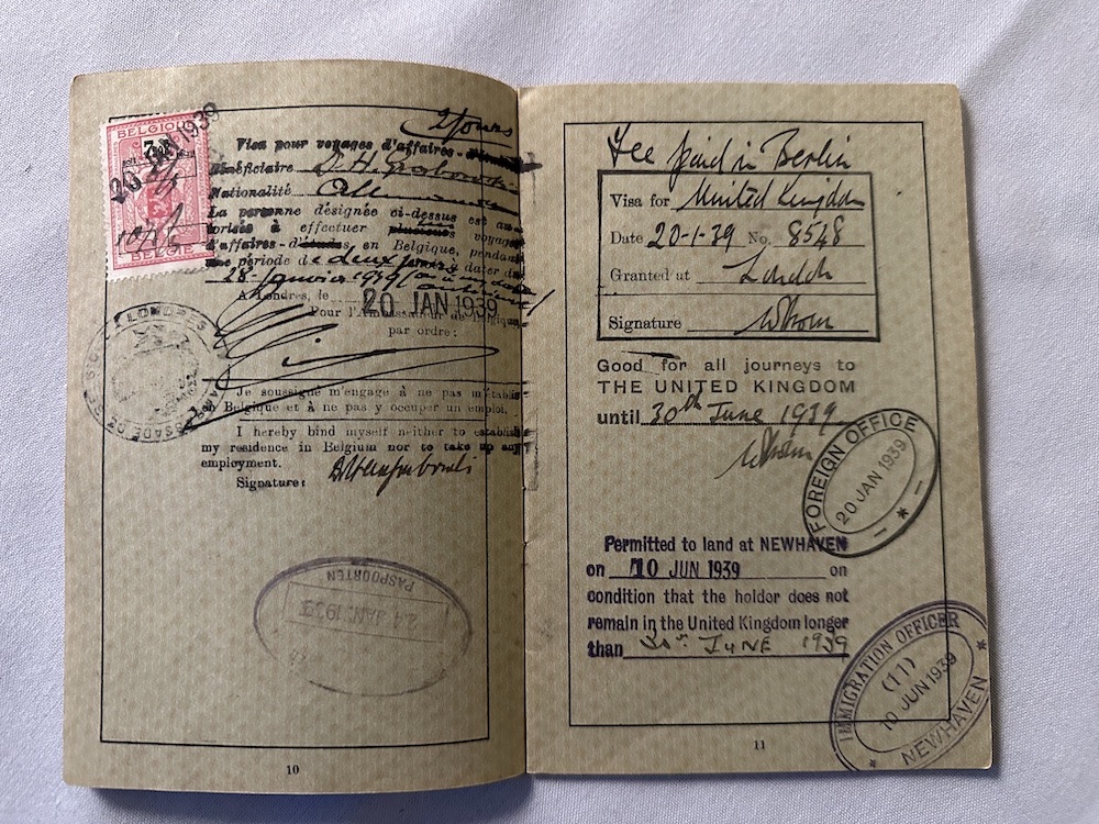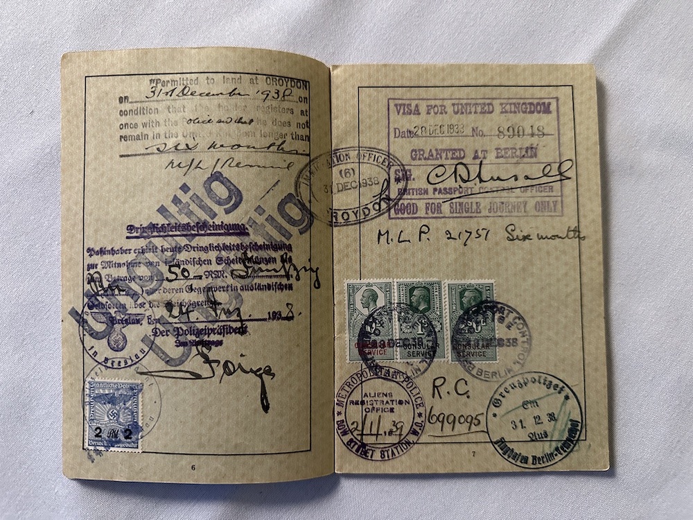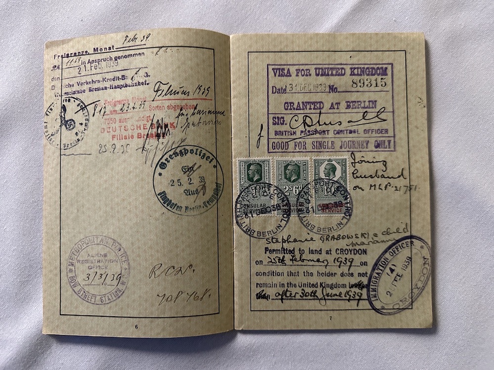 MS: This page of the passport shows her father's visa for the UK for six months. The German stamp is an attestation of urgency allowing to take up to 50 RM or the equivalent in foreign currency across the border"; the big stamp says "invalid"