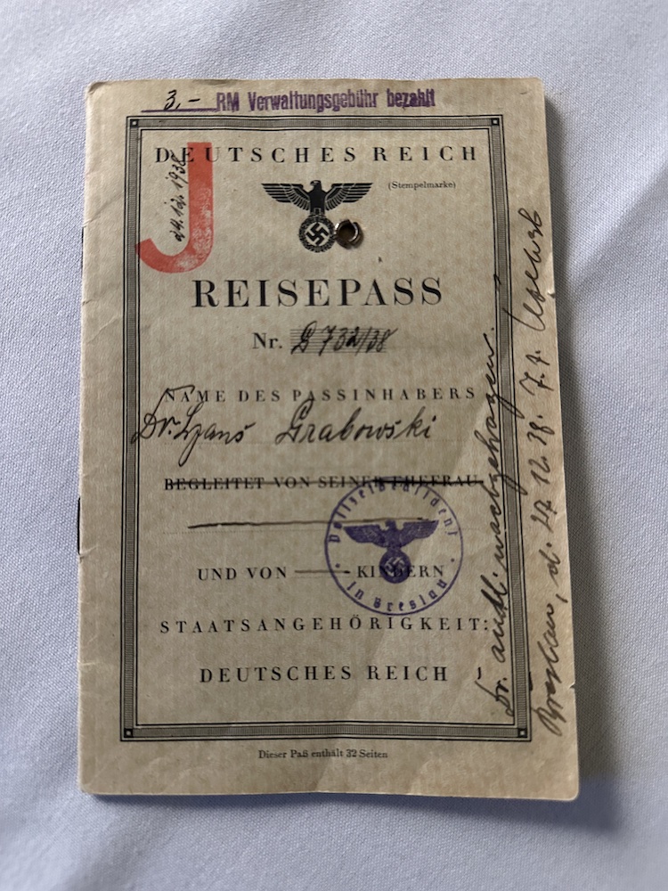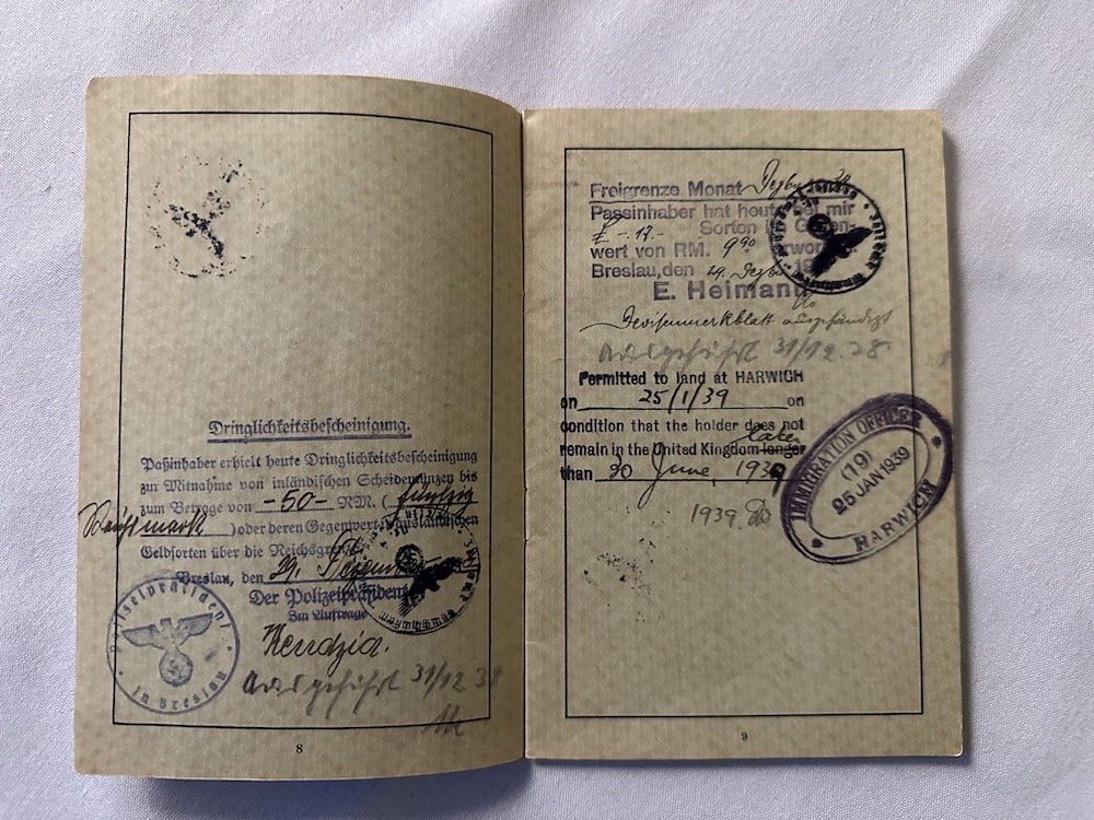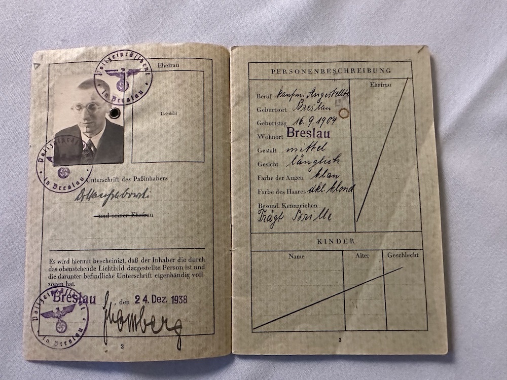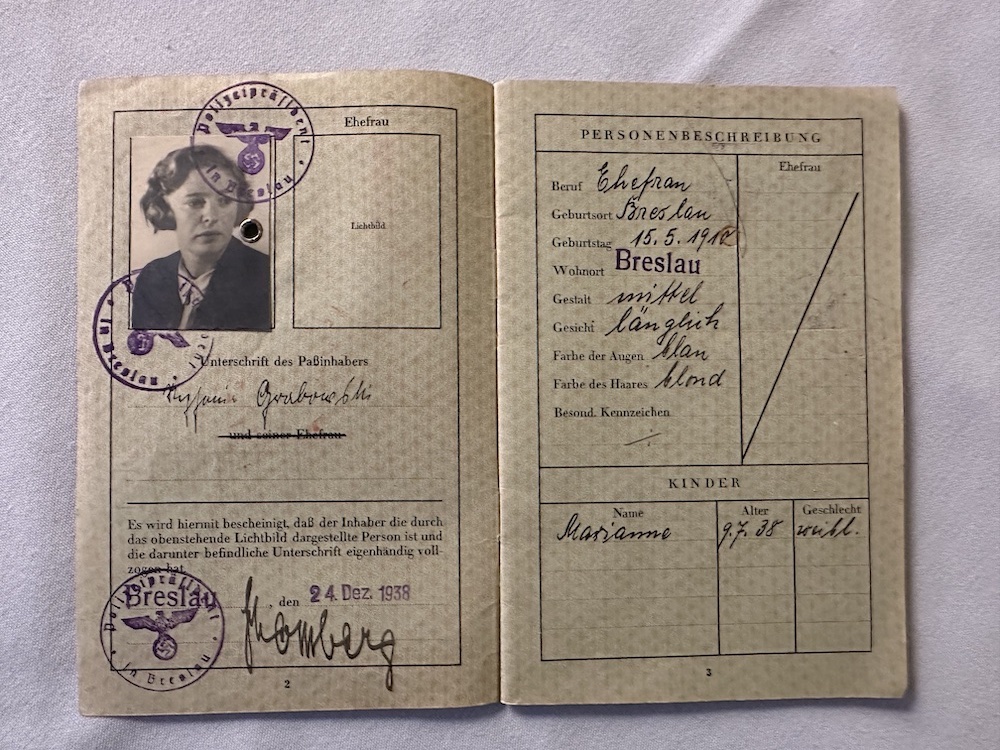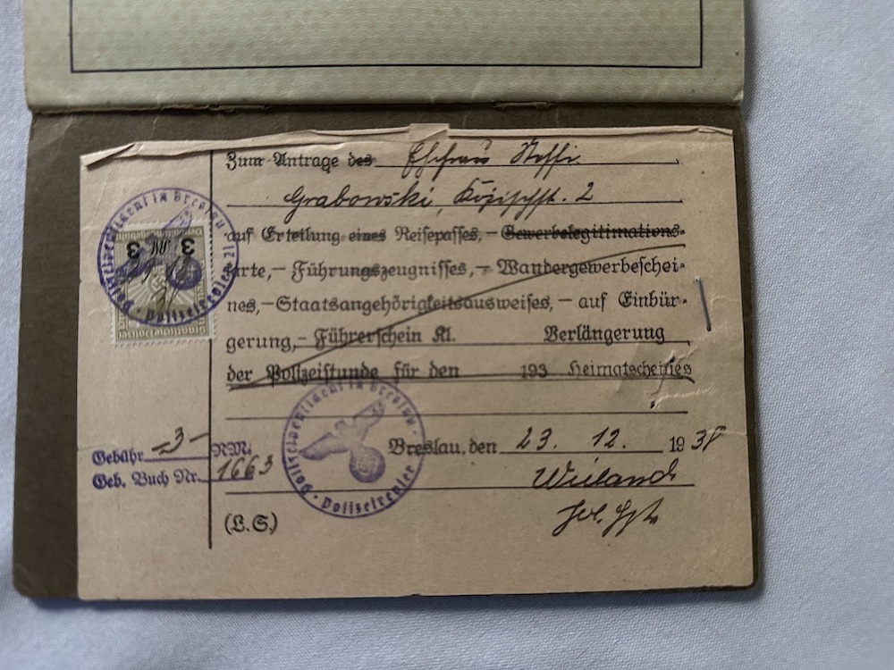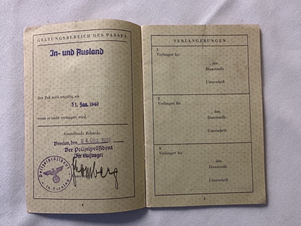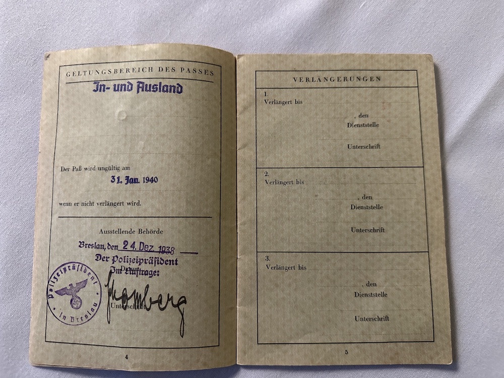 MS: Another page inside her father's passport: issued by the chief of Breslau police on 24th December 1938 - expiry date 31st January 1940