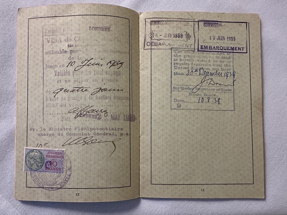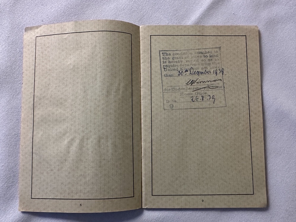 MS: Inside of her mother's passport: "leave to land...requires departure from the UK not later than 30 December 1939"