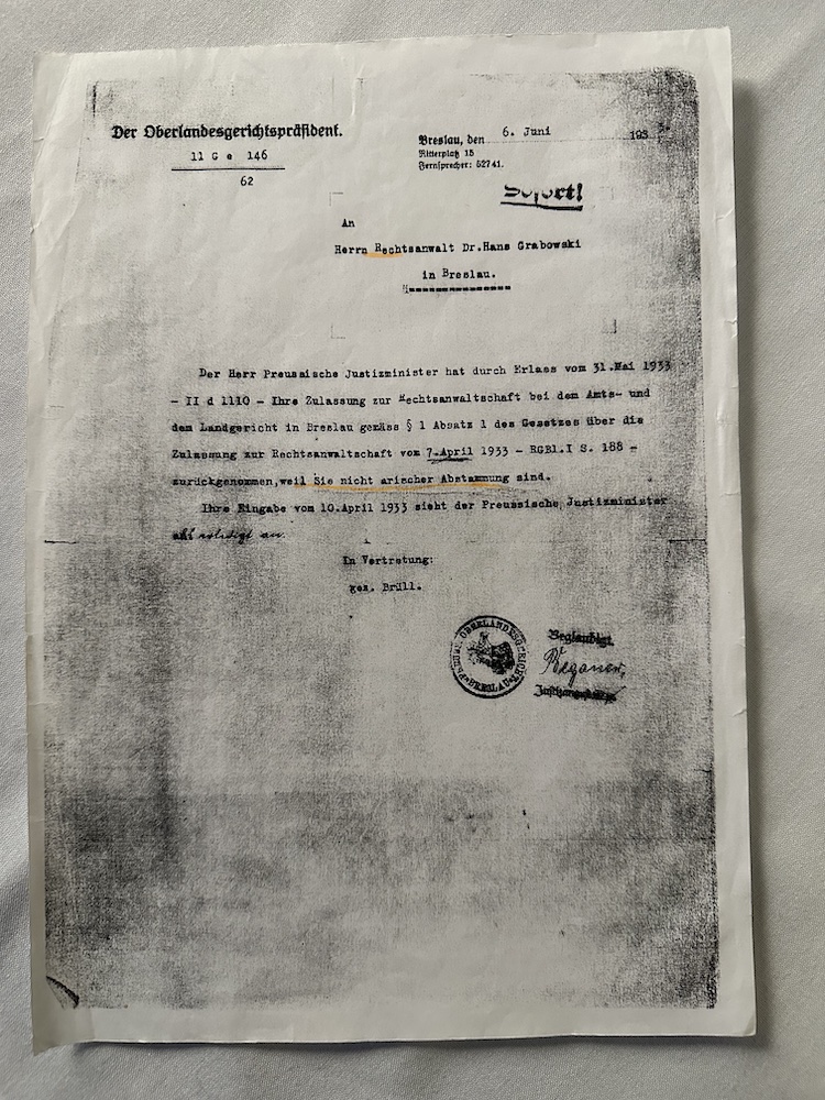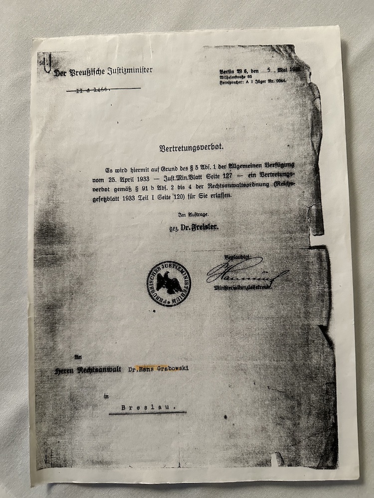 MS: Letter from the infamous Dr. Freisler at the time Minister of Justice for Prussia: Dr. Hans Grabowski was no longer allowed to represent legal clients in court.