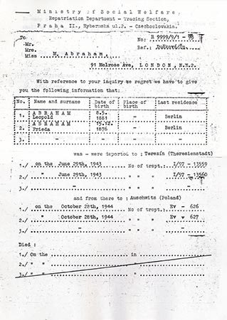 Max Abraham, born in Berlin in 1913, was a technical teacher in Berlin’s Association for the Promotion of Skilled Trades (ORT); ORT is a global Jewish organisation promoting education and training in communities worldwide. In 1939 Max came to England with his wife Hanni, and was initially interned at Kitchener Camp in Sandwich. He left the camp in December 1939 and later worked as a teacher at the ORT school in Leeds. Max’s parents, Frieda and Leopold, were deported to Theresienstadt in 1943 and never returned. A tracing enquiry revealed that they were deported to Auschwitz in 1944, where they were probably murdered.