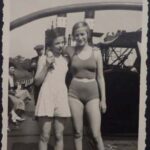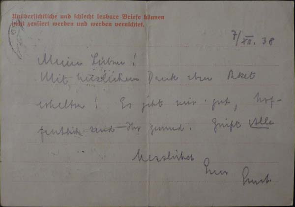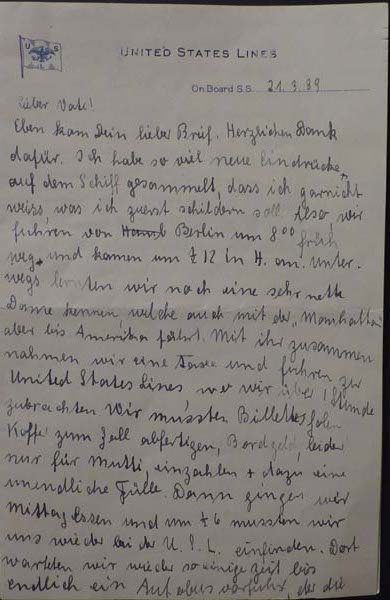 I have gained so many new impressions on the ship that I don't know what to describe. On the way we met a very nice lady travelling with the 'Manhattan' to America. We took a taxi with her to the United States Lines, where we spent over an hour. We had to get tickets, clear suitcases through customs, & unfortunately pay extra money for Mum. Then we had lunch. At 6.30 we had to report back to the U.S.L. We waited there again for some time until a bus finally pulled up, carrying the blue-coated & jacketed guide & information provider. We were given our cabin number, B35 & took the elevator up to deck B. We were shown the room. Unfortunately it's an inside cabin & it's very hot, day & night. I leave the fan running but it makes a big noise. Today I don't remember the details exactly, but everything I hear & see here is sadly difficult to write. On the first evening we went to the cinema. First Mickey Mouse, then Ice Follies with Joan Crawford - English of course. The last part - over half an hour - was an incredibly good colour film. I've already visited the gym, swimming pool, tennis court, children's room, shops, smoking room, dance hall - with jazz band. There are all sorts of hiding places. We have a telephone in the room. Elli Fein is also on board & is also going to Southampton. The doorbell rang this morning. I answered: “Hello? Good Morning! How do you do? Yes, at a quarter to ten let's meet in the dining room. Goodbye! I was almost seasick yesterday, but I went on deck. The air worked wonders. I did recover, but I went all the way to the top & there was a huge storm. When I came down I had a big headache. So I took some Pyramidon & it also went away. So today we are in the port of Le Havre. I'll get off the ship with Mum if it doesn't cost anything. We have a 12 hour layover. Now it's 10 o'clock. The ship doesn't set off again until 10 o'clock in the evening. I'll drop this letter off in Le Havre before noon. I'm at the post office in Le Havre right now. Kisses.