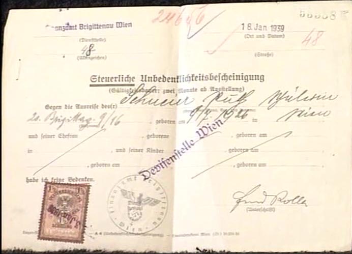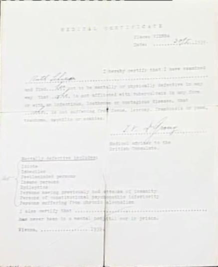 RE: UK Medical certificate to say Ruth had no serious physical or mental illness "and after that I could leave Vienna which I did on the 14th February 1939."