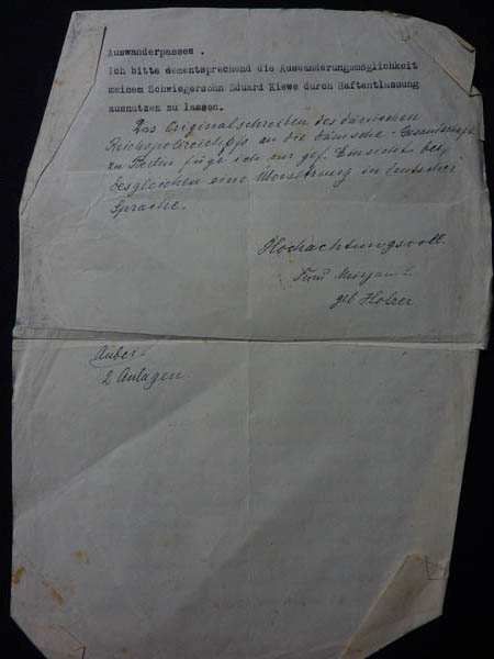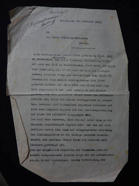 RW: Letter from mother to German police. "This is a letter that my mother wrote when my father was in Sachsenhausen after Kristallnacht. She wrote it to the police