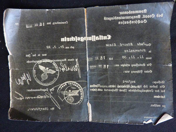 RW: "This is a carbon copy of my father's release document from Sachsenhausen. And it's had to be photographed in a mirror."