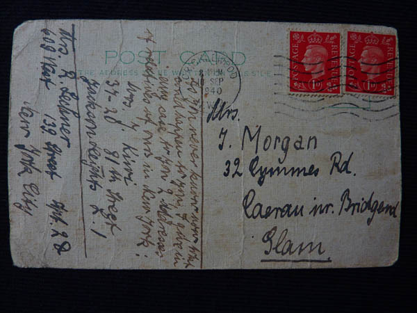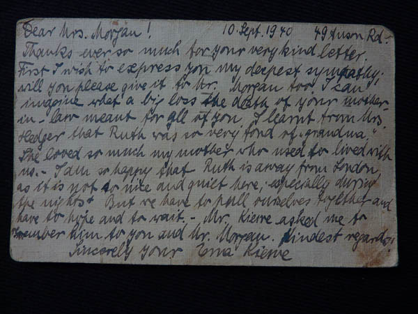 RW: Letter from mother to foster family in Wales. "This is when I was an evacuee in Wales. And a grandmother there of the children there had died. And my mother wrote from London to sympathise and also to thank them for taking care of me and keeping me away from the Blitz."